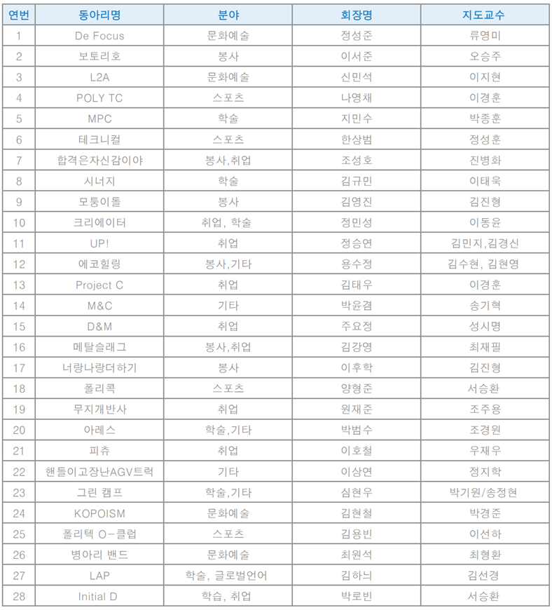 | 연번 | 동아리명 | 분야 | 회장명 | 지도교수 |