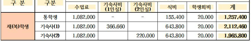 기숙사 입사자의 경우 조,중,석식비가 포함[토,일,공휴일 제외]되어산정되기 때문에 실 납부금액은 학기당(기숙사비, 식비포함) 아래 표 참고하여 주시면 됩니다.