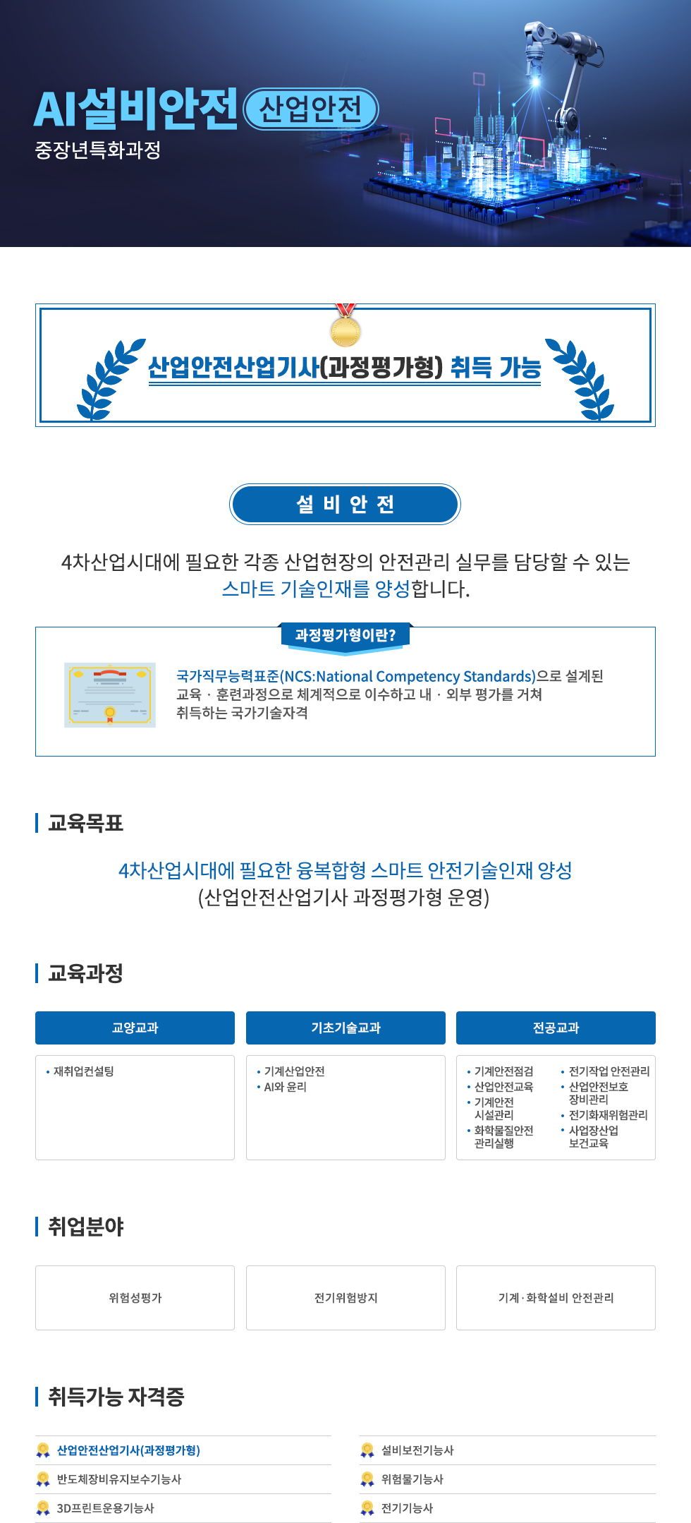 AI설비안전 산업안전 중장년특화과정 산업안전산업기사(과정평가형) 취득 가능 설비안전 4차산업시대에 필요한 각종 산업현장의 안전관리 실무를 담당할 수 있는 스마트 기술인재를 양성합니다. 과정평가형이란? 국가직무능력표준(NCS:National Competency Standards)으로 설계된 교육 · 훈련과정으로 체계적으로 이수하고 내 · 외부 평가를 거쳐 취득하는 국가기술자격 □ 교육목표 4차산업시대에 필요한 융복합형 스마트 안전기술인재 양성 (산업안전산업기사 과정평가형 운영) □ 교육과정 교양교과 - 재취업컨설팅 기초기술교과 - 기계산업안전 - AI와 윤리 전공교과 - 기계안전점검 - 산업안전교육 - 기계안전 시설관리 - 화학물질안전 관리실행 - 전기작업 안전관리 - 산업안전보호 장비관리 - 전기화재위험관리 - 사업장산업 보건교육 □ 취업분야 - 위험성평가 - 전기위험방지 - 기계·화학설비 안전관리 □ 취득가능 자격증 - 산업안전산업기사(과정평가형) - 반도체장비유지보수기능사 - 3D프린트운용기능사 - 설비보전기능사 - 위험물기능사 - 전기기능사