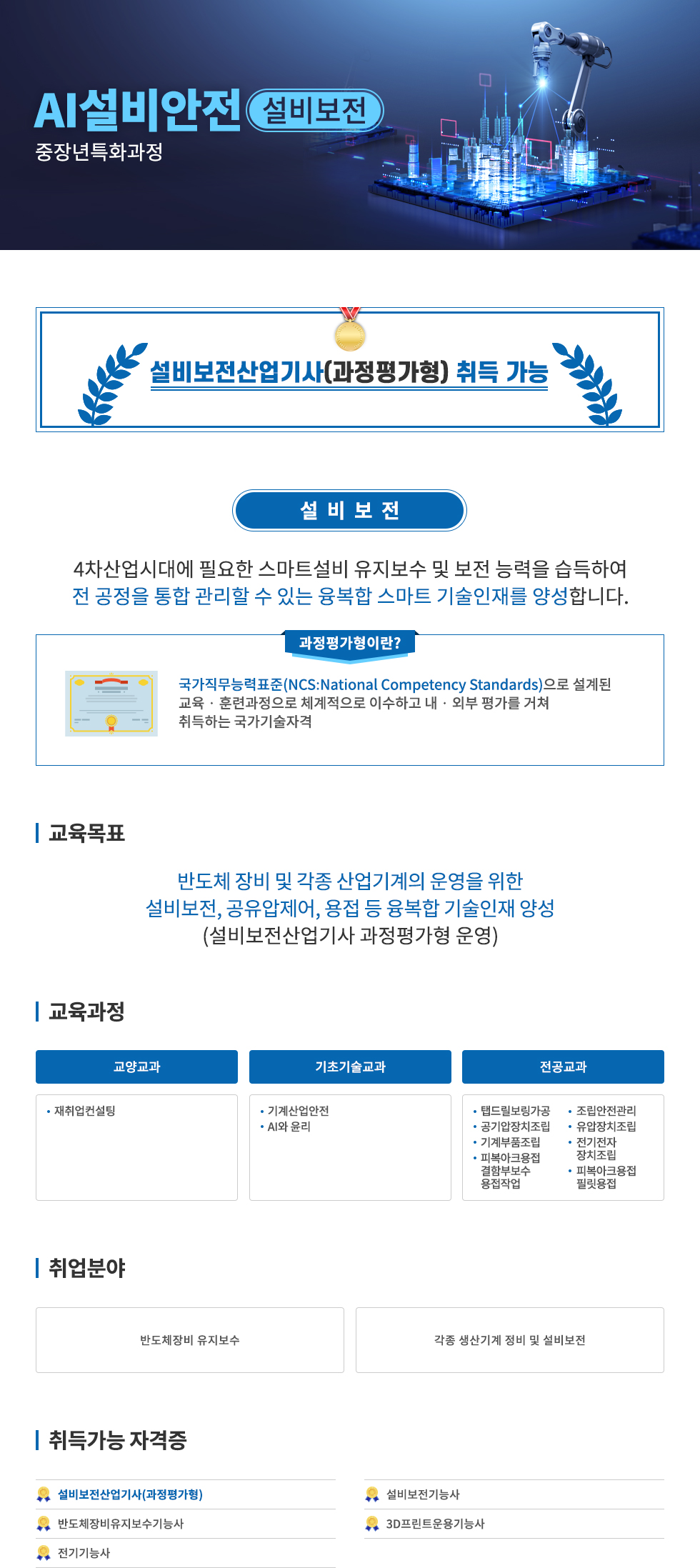 AI설비안전 설비보전 중장년특화과정 설비보전산업기사(과정평가형) 취득 가능 설비보전 4차산업시대에 필요한 스마트설비 유지보수 및 보전 능력을 습득하여 전 공정을 통합 관리할 수 있는 융복합 스마트 기술인재를 양성합니다. 과정평가형이란? 국가직무능력표준(NCS:National Competency Standards)으로 설계된 교육 · 훈련과정으로 체계적으로 이수하고 내 · 외부 평가를 거쳐 취득하는 국가기술자격 □ 교육목표 반도체 장비 및 각종 산업기계의 운영을 위한 설비보전, 공유압제어, 용접 등 융복합 기술인재 양성 (설비보전산업기사 과정평가형 운영) □ 교육과정 교양교과 - 재취업컨설팅 기초기술교과 - 기계산업안전 - AI와 윤리 전공교과 - 탭드릴보링가공 - 공기압장치조립 - 기계부품조립 - 피복아크용접 결함부보수 용접작업 - 조립안전관리 - 유압장치조립 - 전기전자 장치조립 - 피복아크용접 필릿용접 □ 취업분야 - 반도체장비 유지보수 - 각종 생산기계 정비 및 설비보전 □ 취득가능 자격증 - 설비보전산업기사(과정평가형) - 반도체장비유지보수기능사 - 전기기능사 - 설비보전기능사 - 3D프린트운용기능사