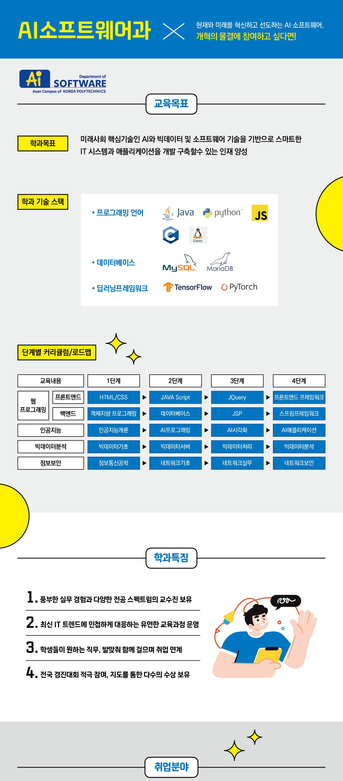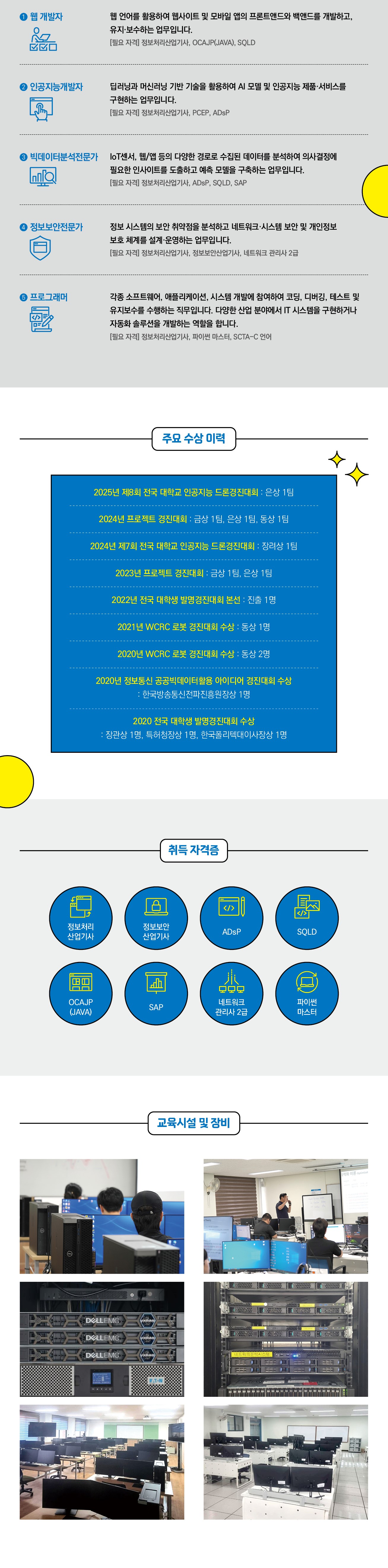 AI 소프트웨어과 미래사회의 핵심 기술인 AI·빅데이터, 사물인터넷(IoT), 정보보안, 네트워크, 소프트웨어 코딩에 대한 실습 중심의 지식을 배우며, 이를 기반으로 향후 모든 산업 및 사회에서 요구되는 인공지능 중심의 IT 전문 기술 인재 양성을 목표로 하고 있습니다. 학과 특징 01: 미래사회의 핵심 기술인 인공지능, 빅데이터, 정보보안등의 정보통신 신기술을 습득 02: 4차 산업 혁명 시대에 맞는 다양한 전문 전공 교수 및 시설 확보 03: 이론 보다는 실습 위주의 부담 없는 분위기의 실무 중심 수업 04: 항상 학생과 소통하는 자유로운 진로 상담 및 학생이 원하는 직무로의 취업 연계 05: 전국규모 경진대회 다수 수상 경험을 바탕으로 모든 학생들에게 참여 기회 부여 및 성실지도 학과 목표 미래사회의 핵심 기술인 AI · 빅데이터 및 정보통신 IT시스템에 대한 신기술을 습득 4차 산업혁명 시대를 선도하는 AI·빅데이터 및 정보통신 IT시스템 개발, 구축 및 운영 할 수 있는 기술 인재 양성을 목표로 하고 있습니다. 교과 내용 정보통신시스템과 AI소프트웨어과 01.AI 빅데이터 : • AI빅데이터 개론 • AI빅데이터 기초실습 • AI빅데이터 응용실습 02.사물인터넷 (IoT) : • 프로그래밍 언어 • 웹프로그래밍 실습 •IoT 센서실습 • IoT 제어실습 • 정보통신공학 03.정보보안: • 정보보안개론 • 정보보안기초실습 • 정보보안응용실습 • 해킹툴실습 04.서버 및 네트워크: • 서버구축실습 • 빅데이터/클라우드서버 실습 • 네트워크 기초 • 네트워크 실무 • 데이터베이스실습 교육시설 및 장비 AI빅데이터 실습실 : 인공지능 및 빅데이터 기초실습, 인공지능 및 빅데이터 응용 실습을 할 수 있다. 서버 및 네트워크 실습실 : 서버구축실습, 빅데이터/클라우드서버 실습, 네트워크 기초, 네트워크 실무, 데이터베이스 실습을 할 수 있다. 정보보안실습실 : 정보보안기초실습, 정보보안응용실습, 해킹툴실습을 할 수 있다. 사물인터넷 실습실 : 프로그래밍 언어, 웹프로그래밍 실습, IoT 센서실습, IoT 제어실습등의 프로그램 위주의 실습을 할 수 있다. 취득자격증 정보처리 산업기사, 정보보안 산업기사, 정보통신 산업기사, 사무자동화 산업기사, 네트워크관리사/CCNA, 리눅스 마스터, 통신선로 산업기사 졸업 후 취업분야 1) AI·빅데이터 응용 개발 2) IoT 네트워크 시스템 구축 및 운영 3) 반도체 소프트웨어 분야 4) IoT 서버 보안 시스템 구축 및 관리 5) 전산시스템 운영 분야 (기업 또는 공공기관 관제/통신/전산실 등) 6) 정보통신망 설치 및 유지보수 7) 통신 산업기기 운영 및 유지보수 분야 최근 3년간 졸업생 취업처 • 삼성SDI • KT • 이든TNS • 삼성전기 • 현대자동차 • 와이즈스톤 • 삼성전자서비스 • IDC 반도체 • SFA • SK네트워크 오앤에스 • 솔브레인 반도체 • 한국니코옵티컬 • CJ 대한통운 • 케이케이테크(외국기업) • 인천공항공사 • 한화규셀 수상이력 경진대회 수상 ★ 2020년 전국 대학생 발명경진대회 수상 - 장관상 1명, 특허청장상 1명, 한국폴리텍대 이사장상 1명 ★ 2020년 정보통신 공공빅데이터 활용 아이디어 경진대회 수상 - 한국방송통신전파진흥원장상 1명 ★ 2020년 WCRC 로봇 경진대회 수상 - 동상 2명