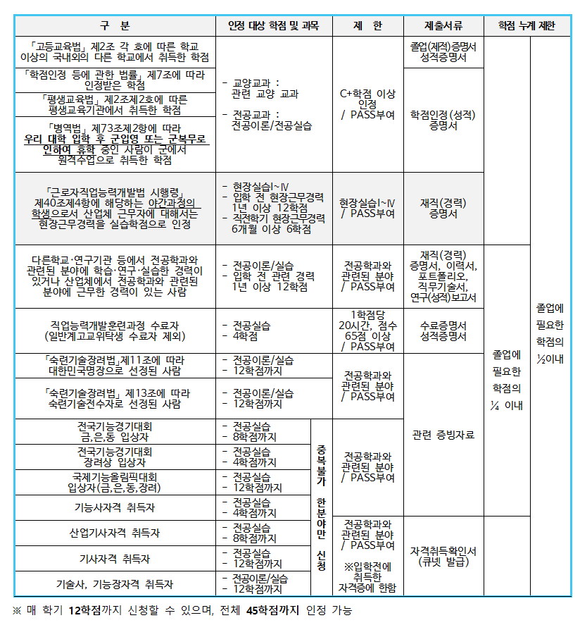 - 자격·경력·대회입상 등의 학점인정 : 졸업학점의 4분의 1범위 내에서 다음 기준에 의해 인정