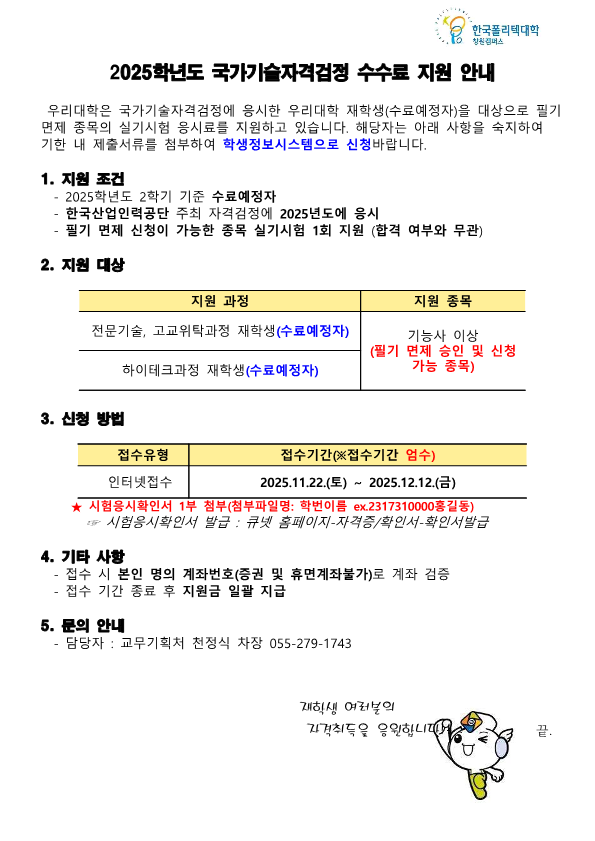 2025년도 국가기술 자격검정 수수료 지원안내(전문기술, 고교위탁, 하이테크과정)