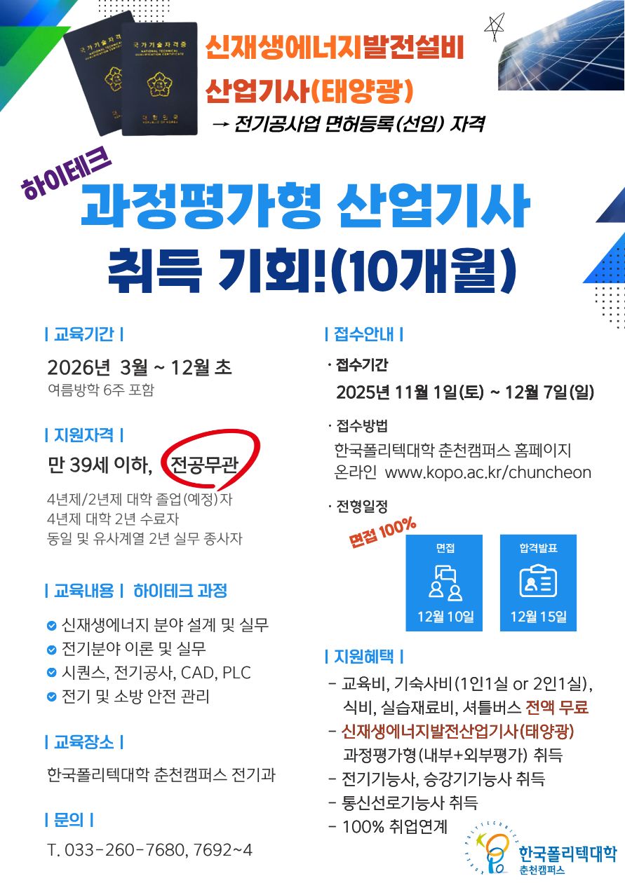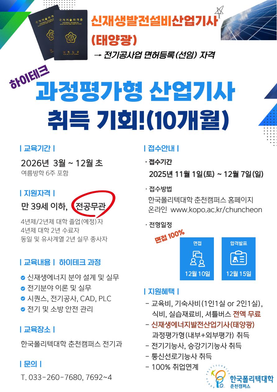 전기설비, 시퀀스, PLC, 공유압, 전력전자, 신재생 등 다양한 기술을 익혀 산업현장의 설계,제작,운용, 유지보수할 수 있는 엔지니어를 양성하고, 우수한 교수진과 첨단 실험실습장비, 체계적인 교육으로 자격증취득과 취업을 위한 학과입니다. ■학과개요 : • 학과비전 : 기초 전기기술에 충실한 융합형 전기 기술인력 양성 • 교육목표 : 철저한 기본지식기반+응용기술적응능력 습득+ 프로젝트 수행능력 향상 • 발전목표 : 지역산업에 기여하는 전기분야의 핵심 학과 ■과정소개 : • 전문기술과정 : 만15세이상 누구나 • 하이테크과정 : 만39세이하 전문대졸 이상이거나 산업기사 이상 취득자이거나 산업체 2년이상 경력자 ■학과강점 01. 열정과 경험이 많은 우수한 교수진 02. 설계, 제어, 안전관리, 공사 등 적성에 맞는 취업분야 제시 03. 산업현장을 적용한 특화된 교육 04. 쾌적한 교육시설과 교육장비 05. 확실한 미래비전제시 ■취득자격증 • 전기 : 전기기능사, 전기산업기사, 전기기능장 • 전기공사 : 전기공사(산업)기사, 신재생에너지 발전설비(산업)기사 • 철도, 소방 : 철도전기기능사, 철도전기(산업)기사, 소방전기(산업)기사 • 기타 : 승강기기능사, 승강기(산업)기사, 산업안전(산업)기사 ■취업분야 01. 가정용, 산업용,스마트전기기기 생산 및 전기공사분야 02. 전기관련 업체의 지능형 전력망시설보수 및 기기설치 관련 업체 03. 스마트그리드 기술관련 전기에너지의 생산 및 운용관련분야 04. 에너지 전력변환기기 및 신재생에너지 관련 업체 05. 생산시설의 전기분야 및 스마트빌딩 시설유지보수관련 분야