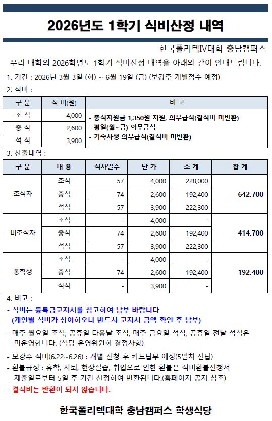 2026년도 1학기 식비 안내