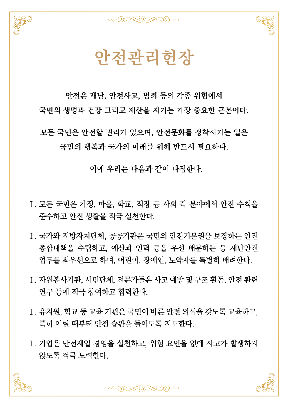 안전관리헌장 안전은 재난, 안전사고, 범죄 등의 각종 위험에서 국민의 생명과 건강 그리고 재산을 지키는 가장 중요한 근본이다. 모든 국민은 안전할 권리가 있으며, 안전문화를 정학시키는 일은 국민의 행복과 국가의 미래를 위해 반드시 필요하다. 아에 우리는 다음과 같이 다짐한다. 1. 모든 국민은 가정, 마을, 학교, 직장 등 사회 각 분야에서 안전 수직을 준소하고 안전 행활을 적극 실천한다. 1. 국가와 지방자치단체, 공공기관은 국민의 안전기본권을 보장하는 안전 종합대책을 수립하고, 예산과 인력 등륵 우선 배분하는 등 재난안전 업무를 최우선으로 하며, 어린이, 장애인, 노약자를 특별히 배려한다. 1. 자원봉사기관, 시민단체, 전문가들은 사고 예방 및 구조 활동, 안전 관련 연구 등에 적극 참여하고 협력한다. 1. 유치원, 학교 등 교육 기관은 국민이 바른 안전 의식을 갖도록 교육하고, 특히 어릴 떄부터 안전 습관을 들이도록 지도한다. 1. 기업은 안전제일 경영을 실청하고, 위험 요일을 없애 사고가 발행하지 않도록 적극 노력한다.