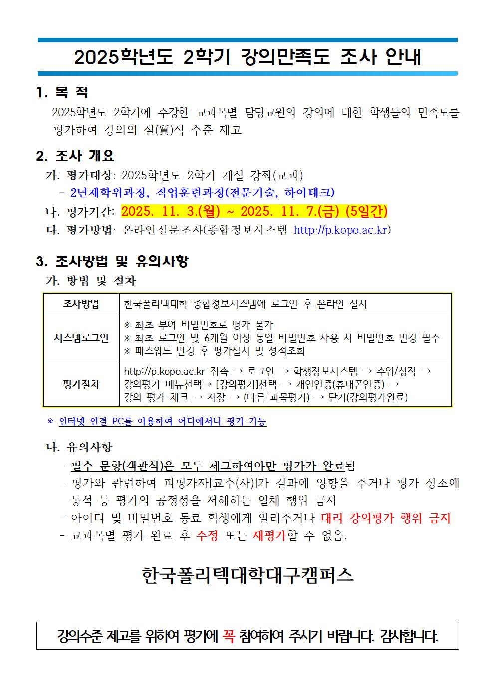 | 2025학년도 2학기 강의만족도 조사 실시 안내 | |