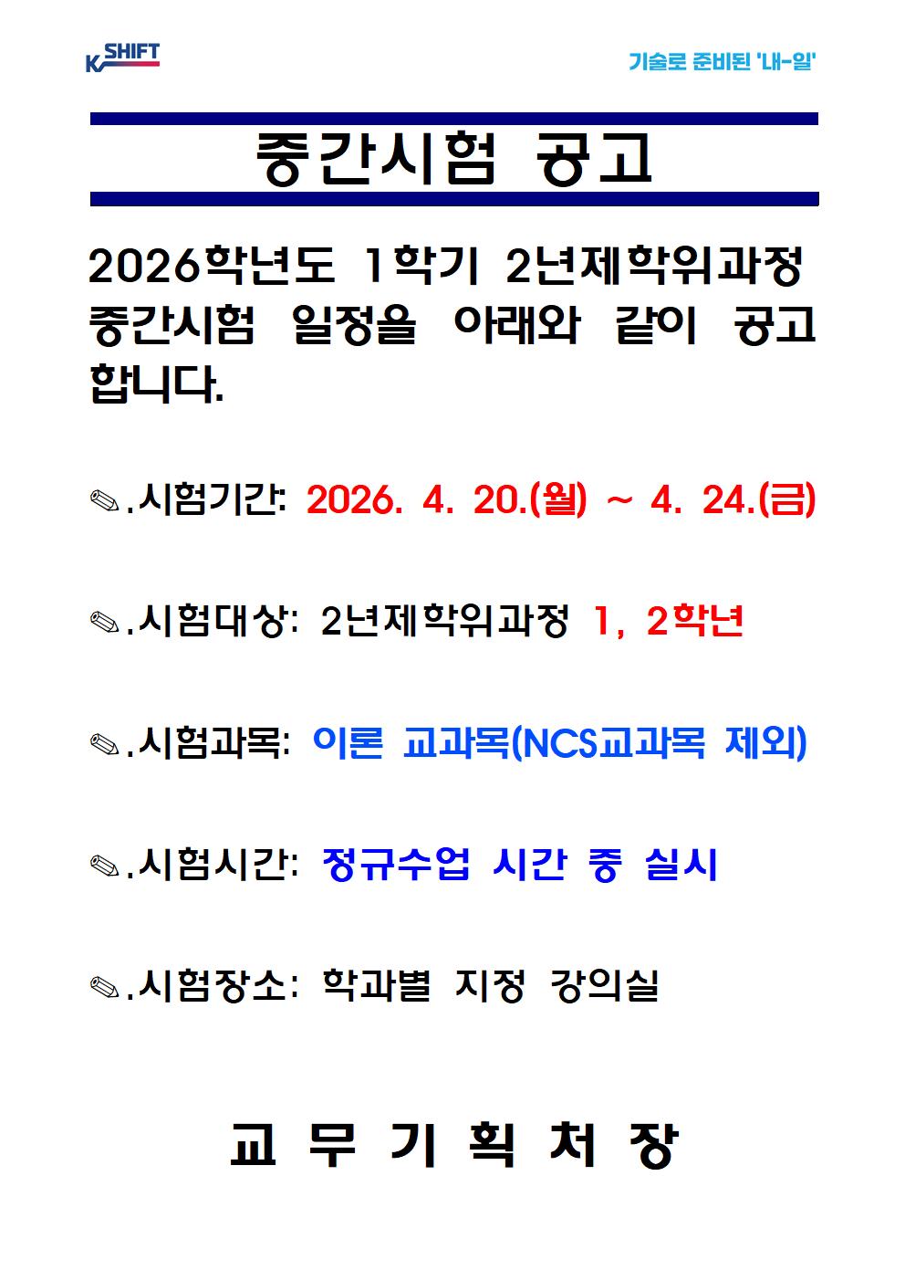 [2년제학위과정] 2026학년도 1학기 중간시험 일정 공고(4.20.(월)~4.24.(금))