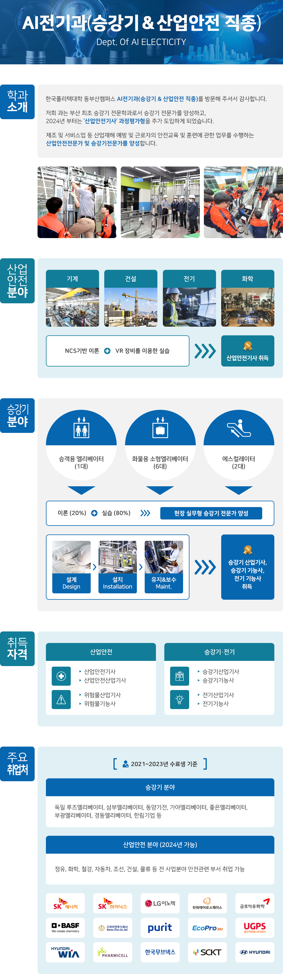 승강기안전과 Department of Lift Safety ■ 학과소개 한국폴리텍대학 동부산캠퍼스 승강기안전과를 방문해 주셔서 감사합니다. 저희 과는 부산 최초 승강기 전문학과로서 승강기 전문가를 양성하고, 2024년 부터는 ‘산업안전기사’ 과정평가형을 추가 도입하게 되었습니다. 제조 및 서비스업 등 산업재해 예방 및 근로자의 안전교육 및 훈련에 관한 업무를 수행하는 산업안전전문가 및 승강기전문가를 양성합니다. ■ 산업안전 분야 - 기계 - 건설 - 전기 - 화학 NCS기반 이론 + VR 장비를 이용한 실습 → 산업안전기사 취득 ■ 승강기 분야 - 승객용 엘리베이터(1대) - 화물용 소형엘리베이터(6대) - 에스컬레이터(2대) 이론(20%) + 실습(80%) → 현장 실무형 승강기 전문가 양성 설계/Design → 설치/Installation → 유지&보수/Maint. → 승강기 산업기사, 승강기 기능사, 전기 기능사 ■ 취득 자격 - 산업안전 · 산업안전기사, 산업안전산업기사 · 위험물산업기사, 위험물기능사 - 승강기·전기 · 승강기산업기사, 승강기기능사 · 전기산업기사, 전기기능사 ■ 주요 취업처 2021~2023년 수료생 기준 - 승강기 분야 : 독일 루츠엘리베이터, 삼부엘리베이터, 동양기전, 가야엘리베이터, 좋은엘리베이터, 부광엘리베이터, 경동엘리베이터, 한림기업 등 - 산업안전 분야 (2024년 가능) : 정유, 화학, 철강, 자동차, 조선, 건설, 물류 등 전 사업분야 안전관련 부서 취업 가능 SK에너지, SK하이닉스, Lg이노텍, 한화에어로스페이스, 금호석유화학, O·BASF, 고여아연주식회사, purit, EcoPro BM, UGPS 울산지피에스주식회사, HYUNDAI WIA, PHARMICELL, 한국무브넥스, SCKT, HYUNDAI