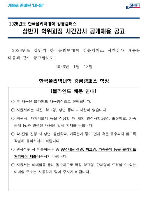 | 2026학년도 상반기 강릉캠퍼스 학위과정 신규 시간강사 채용 공고 | |