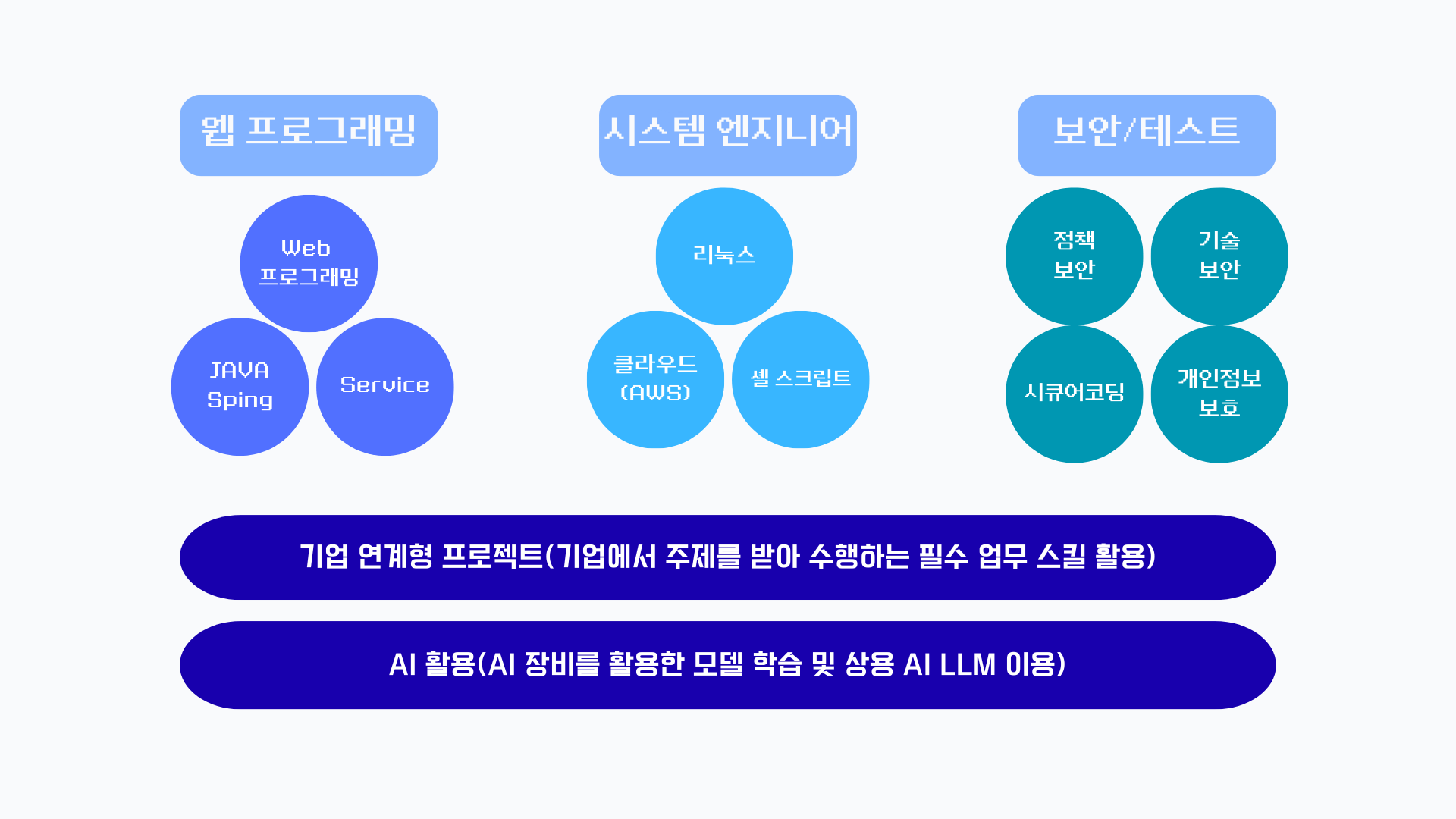 응용 소프트웨어 개발 (Front-end, Back-end), 시스템 엔지니어 (시스템, 보안, DB, 성능, 튜닝), 인공지능 활용 기술, 클라우드 기반 정보시스템 운영능력(AWS, GCP)을 갖춘 개발 직무 능력과 엔지니어 직무 능력을 겸비한 양손잡이형 인재 양성 |