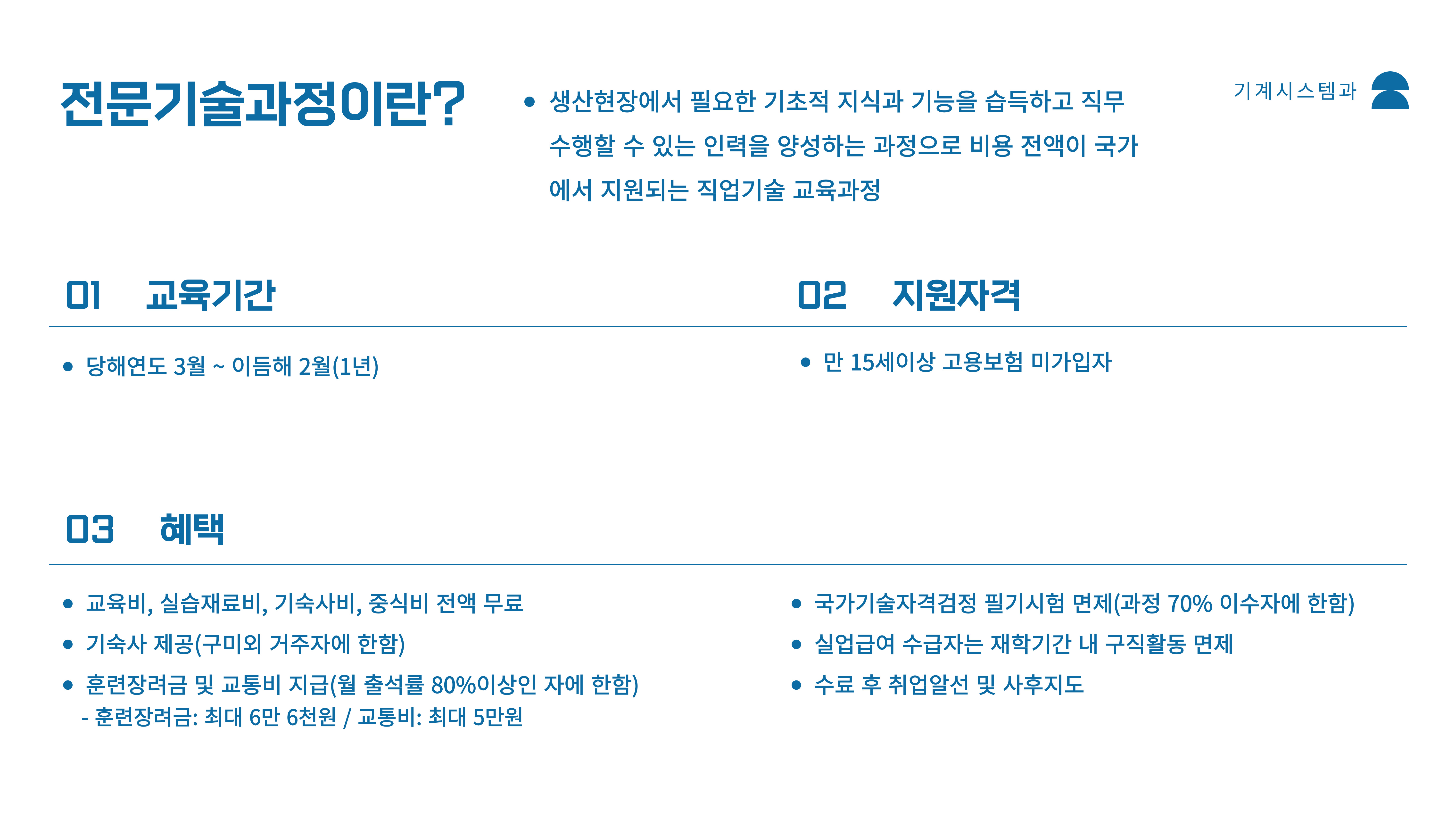 . CAD/CAM 소프트웨어를 이용하여 자동화장치 및 기계부품을 설계할 수 있는 기술/기능인을 양성. . CNC공작기계의 프로그램을 작성하고 조작방법을 익히고 각종 범용 공작기계를 조작하여 정밀기계부품을 가공할 수 있는 기술/기능인을 양성. . 3차원 측정기 및 각종 측정장비를 활용할 수 있는 능력을 배양하여 회사 내 생산되는 제품의 품질을 관리할 수 있는 기술/기능인을 양성.