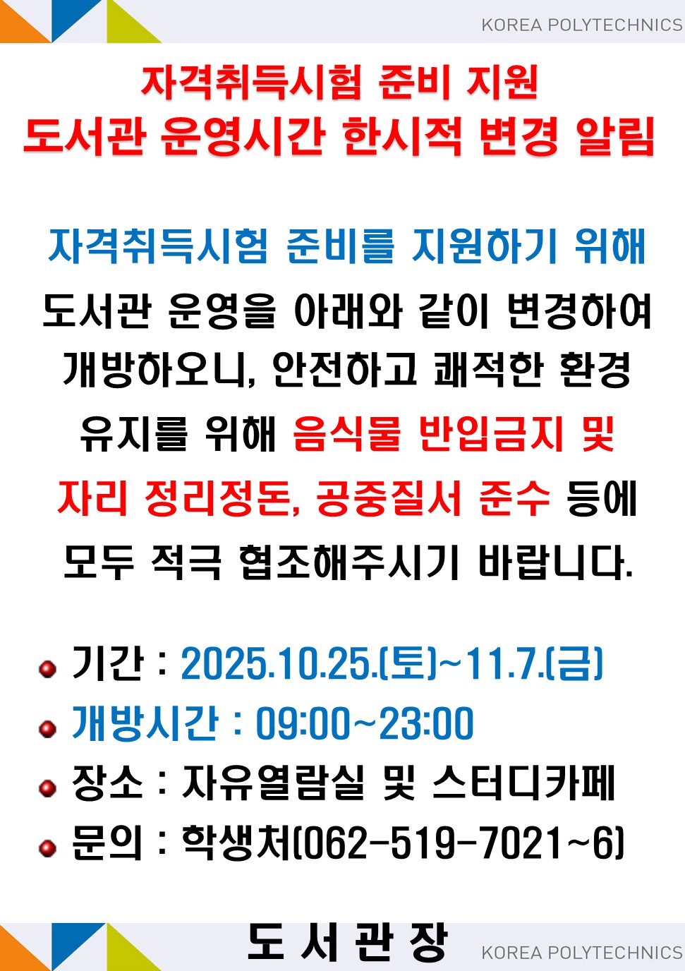 | 재학생 자격취득시험 준비 지원을 위한 도서관&스터디카페 운영시간 한시적 변경 알림 | |