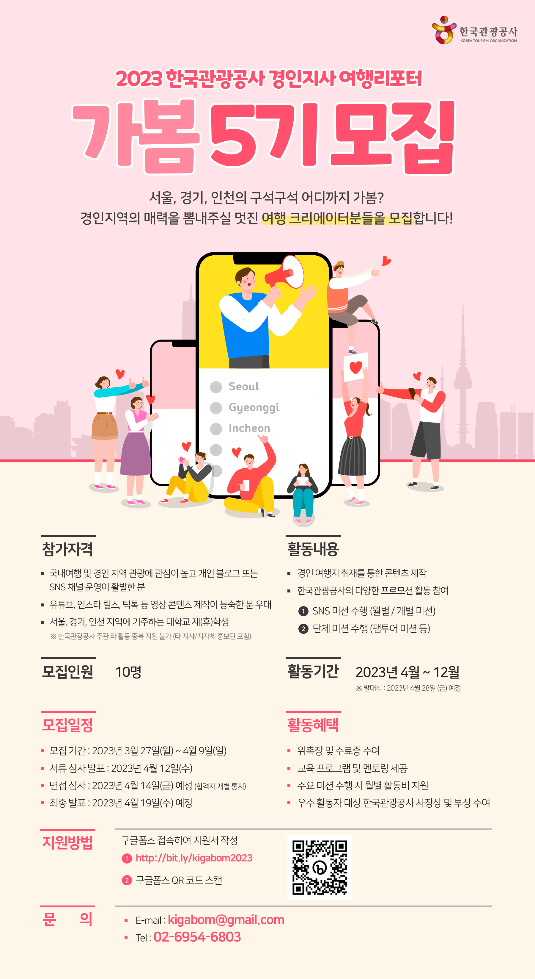 | 2023 한국관광공사 경인지사 여행리포터 가봄 5기 모집 안내 | |