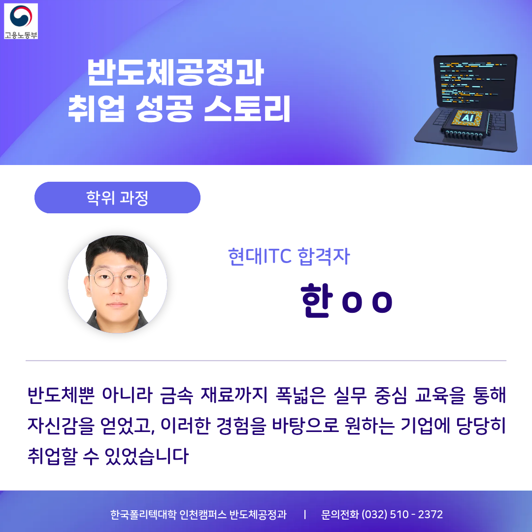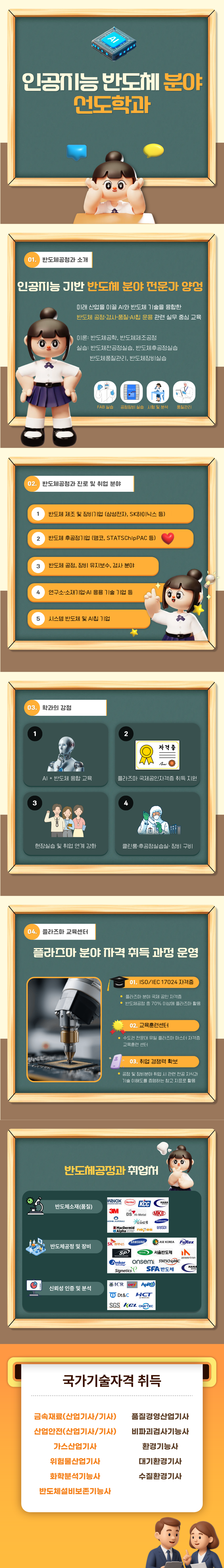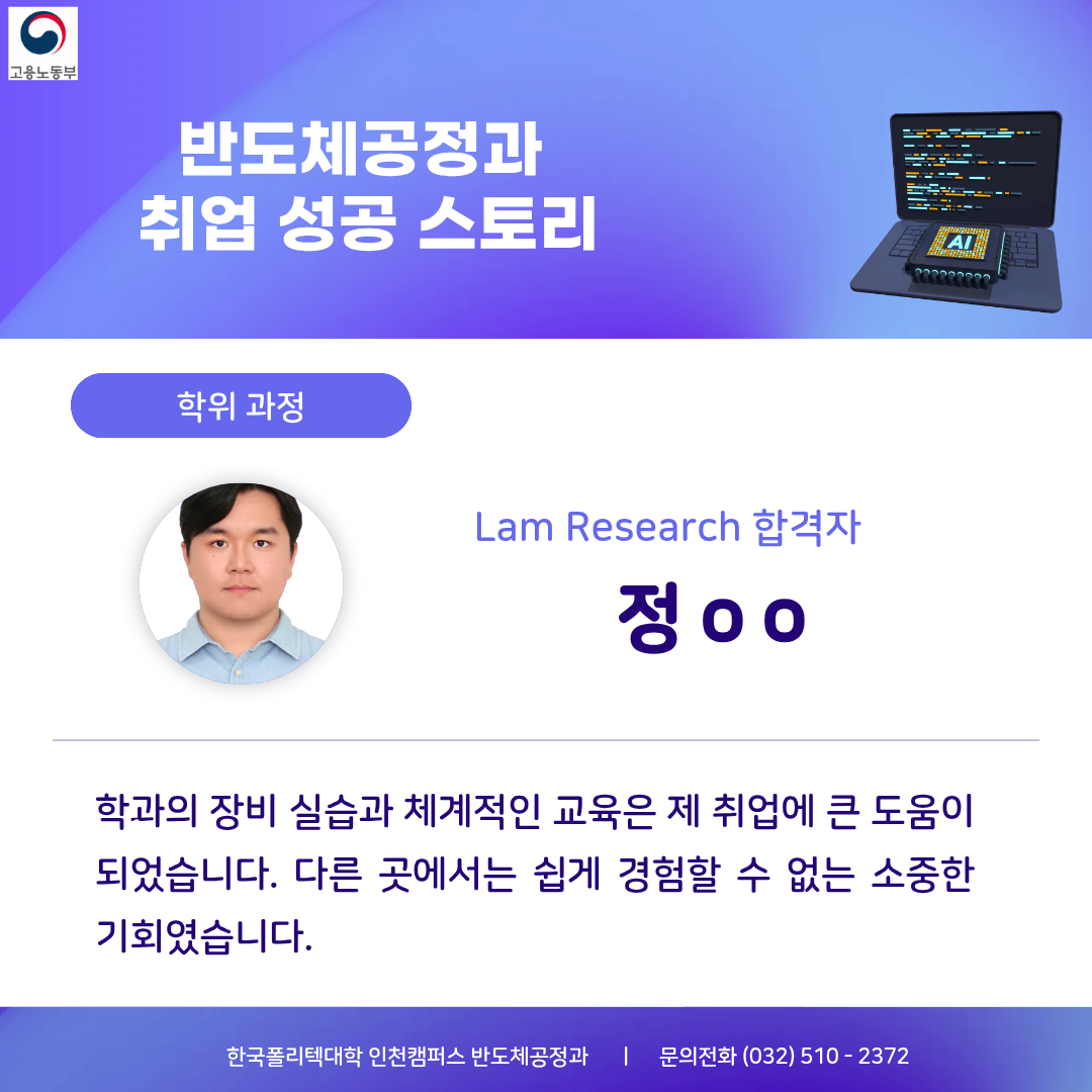 한국폴리텍대학 인천캠퍼스 인공지능 반도체 선도학과 반도체 팹, 공정실습, 장비 교육, 품질관리까지 반도체공정과와 함께 반도체 인재 양성 ■교육과정 반도체 전공정, 후공정 실습, 반도체 장비 운용, 분석장비 측정, 반도체 품질(품질관리, 신뢰성/인증) ▶플라즈마 분야 국제 공인 자격 취득 과정 운영 1. ISO/IEC 17024 국제 공인 자격증 2. 교육훈련센터(반도체공정과) 3. 자격증 취득(수료증 발급) ●미세화: 나노미터급 패턴 형성은 플라즈마 없이 불가능 ●정밀제어: 식각 속도, 선택비, 균일도 정밀하게 제어 가능 ●범용성: 70% 이상의 반도체공정에 플라즈마 적용 ●산업적 가치: 삼성전자, SK하이닉스 등 기업의 수율 확보와 공정 경쟁력에 영향 ■국가기술자격 취득 금속재료산업기사,품질경영산업기사,산업안전산업기사,위험물산업기사 표면처리산업기사,가스산업기사,기계설비산업기사,화학분석기능사, 금속재료시험기능사,반도체설비보존기능사,제선기능사,제강기능사 ■반도체 소재/제조/분석별 취업처 √ 종합 반도체 제조사(삼성, SK)의 주요 협력사 등과 협력 관계 구축 √ 인천 및 부천 지역 반도체 기업과 MOU를 통한 산업현장 체험 및 취업 √ 취업 매칭 프로그램 운영 : 재직자 교육, 기업체 특강, 방문 견학 등 ▶반도체소재(품질/신뢰성) INNOX, Henkel, KCC, HANA MATERIALS, 3M, Hi-Metal, MKE, WONIK MATERIALS, eict, 삼성SDI MacDermid Alpha, nepes ▶반도체 제조 (공정) SK 하이닉스, SAMSUNG, ASE KOREA, FuRex, SP,서울반도체,powertron, Amkor Technology,onsemi, STATSChipPAC Signetics,SFA반도체,HANA MATERIALS ▶신뢰성 인증 및 분석 센터 ICR, QRT, APRO, Dt&C, HСТ, SGS, KCL, ONETEC FIT Testing & Research Institute