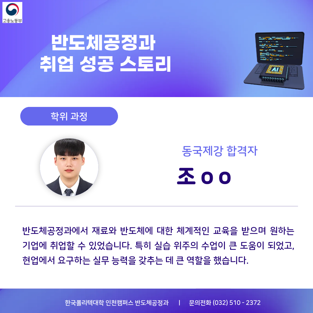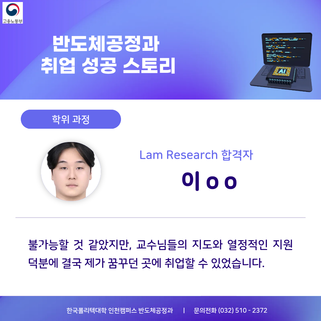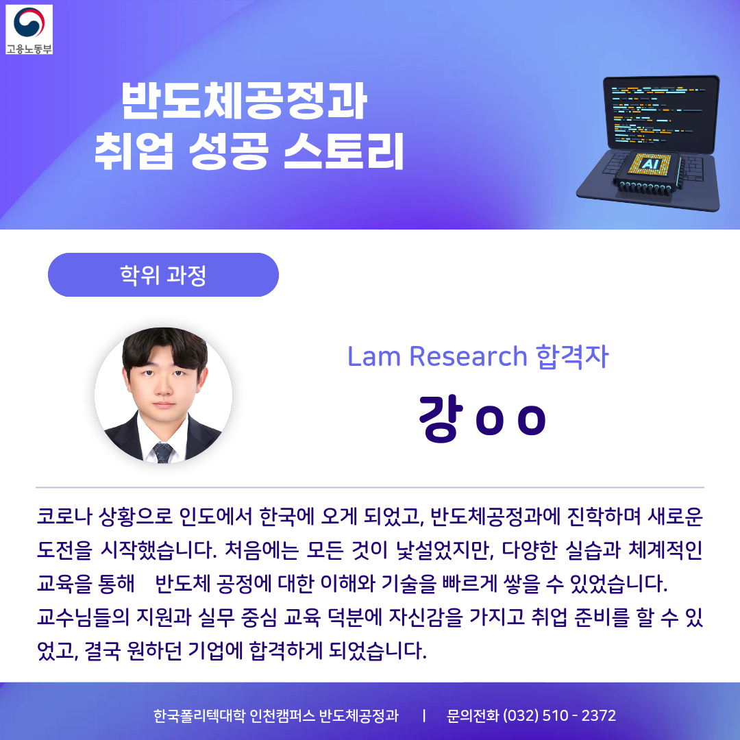 한국폴리텍대학 인천캠퍼스 인공지능 반도체 선도학과 반도체 팹, 공정실습, 장비 교육, 품질관리까지 반도체공정과와 함께 반도체 인재 양성 ■교육과정 반도체 전공정, 후공정 실습, 반도체 장비 운용, 분석장비 측정, 반도체 품질(품질관리, 신뢰성/인증) ▶플라즈마 분야 국제 공인 자격 취득 과정 운영 1. ISO/IEC 17024 국제 공인 자격증 2. 교육훈련센터(반도체공정과) 3. 자격증 취득(수료증 발급) ●미세화: 나노미터급 패턴 형성은 플라즈마 없이 불가능 ●정밀제어: 식각 속도, 선택비, 균일도 정밀하게 제어 가능 ●범용성: 70% 이상의 반도체공정에 플라즈마 적용 ●산업적 가치: 삼성전자, SK하이닉스 등 기업의 수율 확보와 공정 경쟁력에 영향 ■국가기술자격 취득 금속재료산업기사,품질경영산업기사,산업안전산업기사,위험물산업기사 표면처리산업기사,가스산업기사,기계설비산업기사,화학분석기능사, 금속재료시험기능사,반도체설비보존기능사,제선기능사,제강기능사 ■반도체 소재/제조/분석별 취업처 √ 종합 반도체 제조사(삼성, SK)의 주요 협력사 등과 협력 관계 구축 √ 인천 및 부천 지역 반도체 기업과 MOU를 통한 산업현장 체험 및 취업 √ 취업 매칭 프로그램 운영 : 재직자 교육, 기업체 특강, 방문 견학 등 ▶반도체소재(품질/신뢰성) INNOX, Henkel, KCC, HANA MATERIALS, 3M, Hi-Metal, MKE, WONIK MATERIALS, eict, 삼성SDI MacDermid Alpha, nepes ▶반도체 제조 (공정) SK 하이닉스, SAMSUNG, ASE KOREA, FuRex, SP,서울반도체,powertron, Amkor Technology,onsemi, STATSChipPAC Signetics,SFA반도체,HANA MATERIALS ▶신뢰성 인증 및 분석 센터 ICR, QRT, APRO, Dt&C, HСТ, SGS, KCL, ONETEC FIT Testing & Research Institute