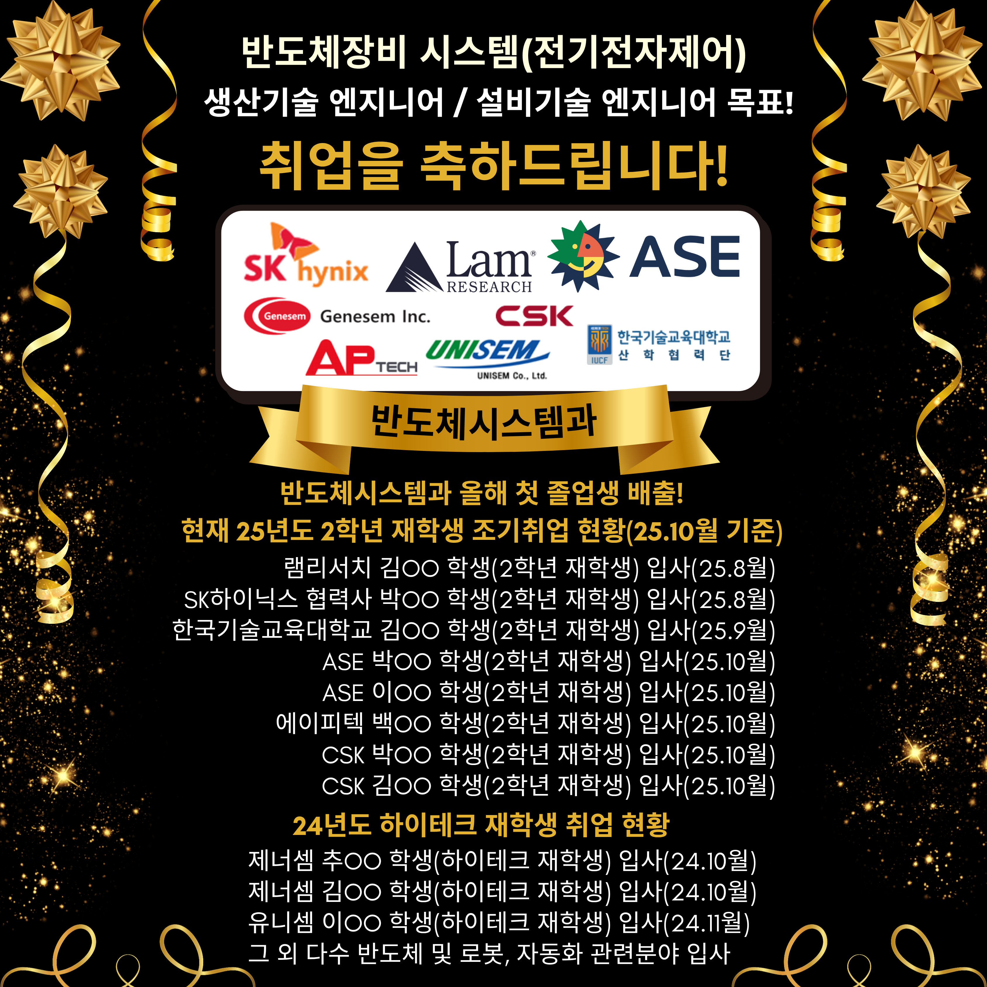반도체장비 시스템(전기전자제어) 생산기술 엔지니어/설비기술 엔지니어 목표! 취업을 축하드립니다! SK hynix, Lam RESEARCH, UNISEM Genesem Inc., 한국기술교육대학교 산학협력단 반도체시스템과 24년 신설학과 올해 첫 졸업생 배출! 현재 25년도 2학년 재학생 조기취업 현황 (25.8월 기준) 램리서치: 김OO 학생(2학년 재학생) 입사(25.8월) SK하이닉스 협력사: 박OO 학생(2학년 재학생) 입사(25.8월) 한국기술교육대학교 김OO 학생(2학년 재학생) 입사(25.9월) 24년도 하이테크 재학생 취업 현황 제너셈: 추OO 학생(하이테크 재학생) 입사(24.10월) 제너셈: 김OO 학생(하이테크 재학생) 입사(24.10월) 유니셈: 이OO 학생(하이테크 재학생) 입사(24.11월) 그 외 다수 반도체 및 로봇, 자동화 관련분야 입사