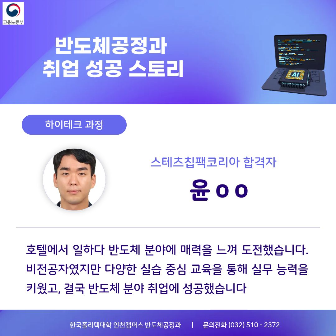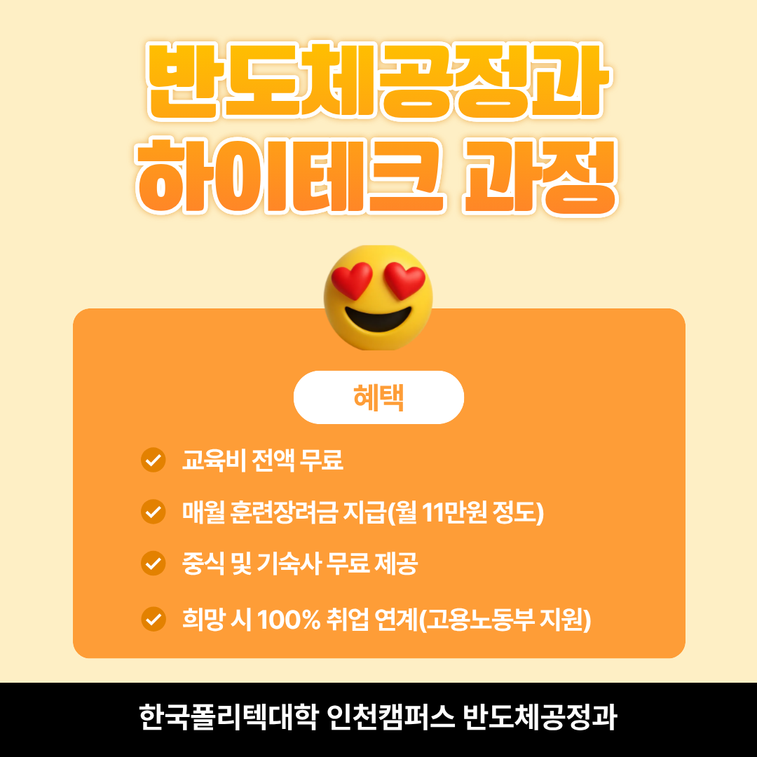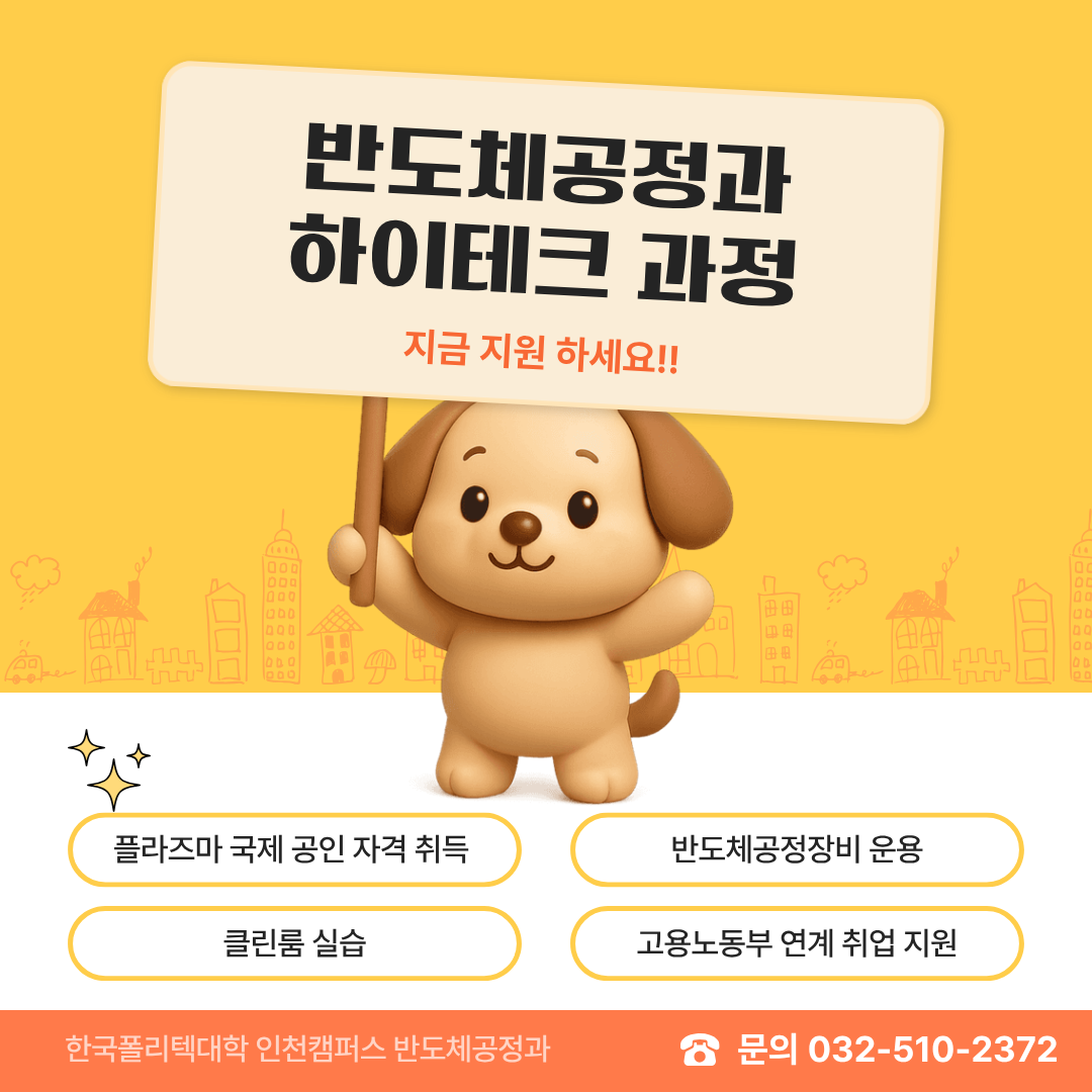 국가(고용노동부)가 지원하는 한국폴리텍 인천캠퍼스에서 실무 중심의 K-반도체인재를 양성합니다.