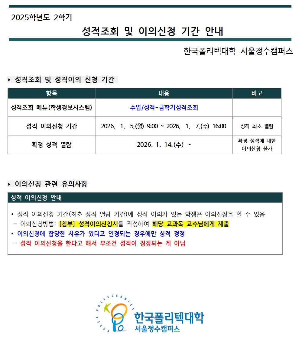 [2년제학위/전공심화] 25-2학기 성적조회 안내(1/5(월) 9시 ~ 1/7(수) 16시)