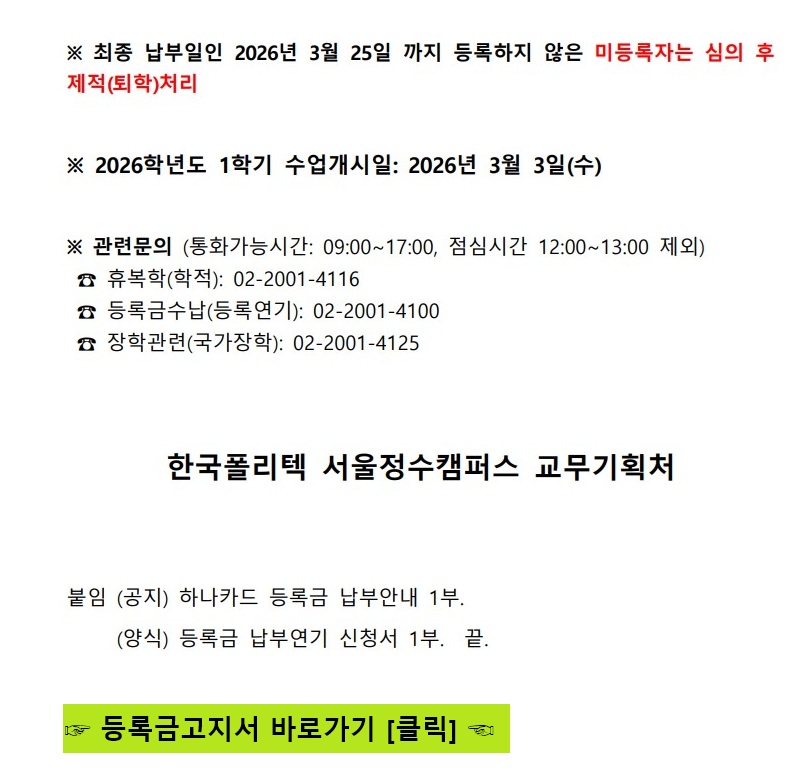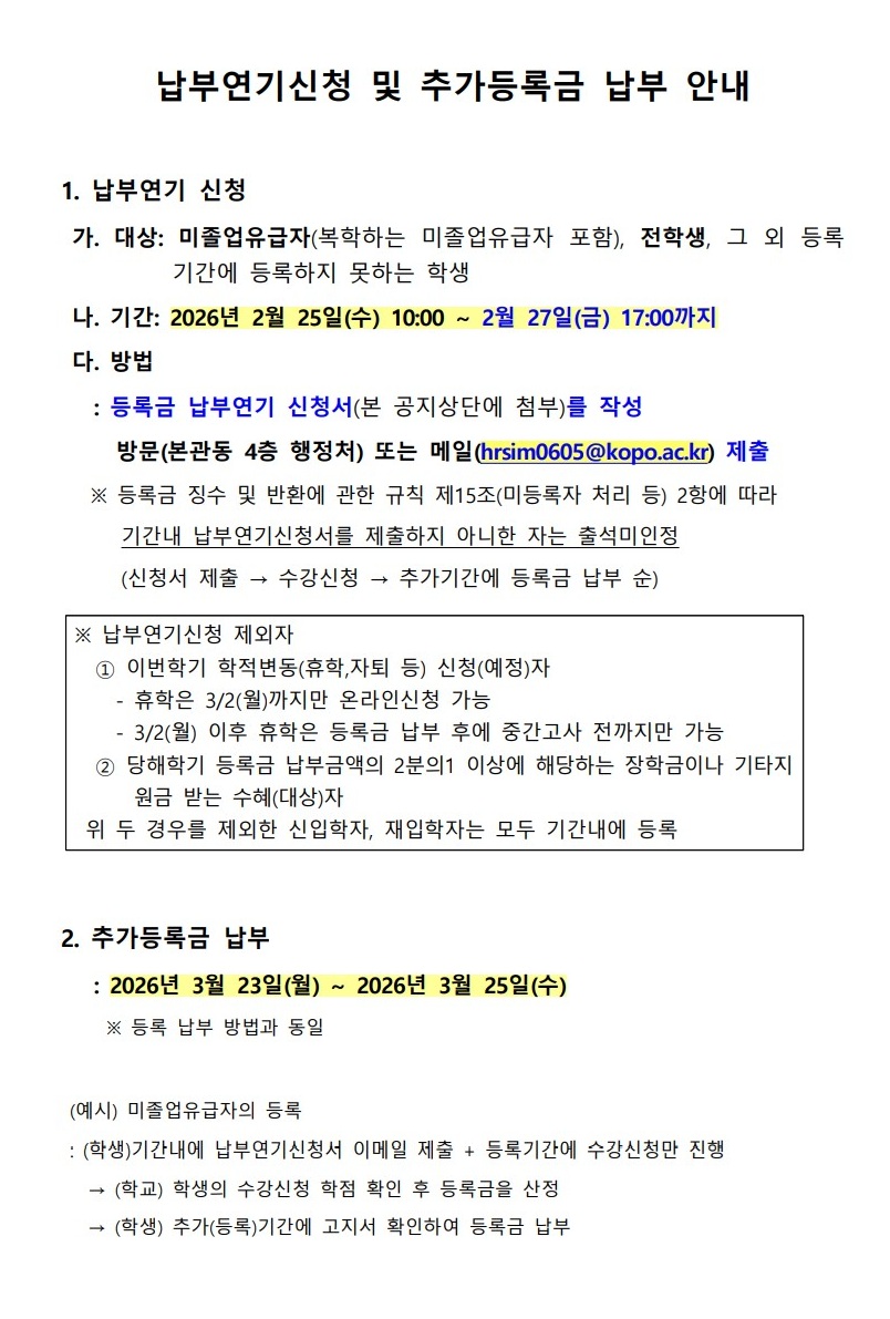 | 2026학년도 1학기 등록(★등록금납부, ★납부연기신청) 안내 - 기존 재학생, 복학생(전학생 포함), 재입학생 | |