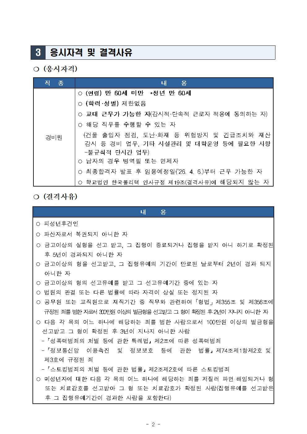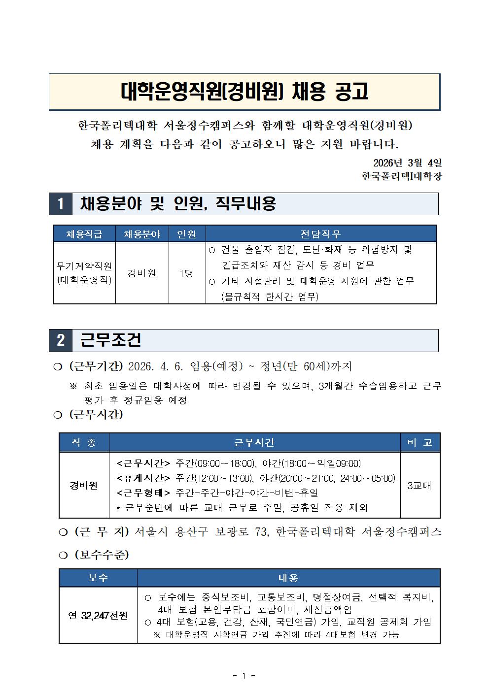 | 2026년도 대학운영직(경비원) 채용 공고 | |