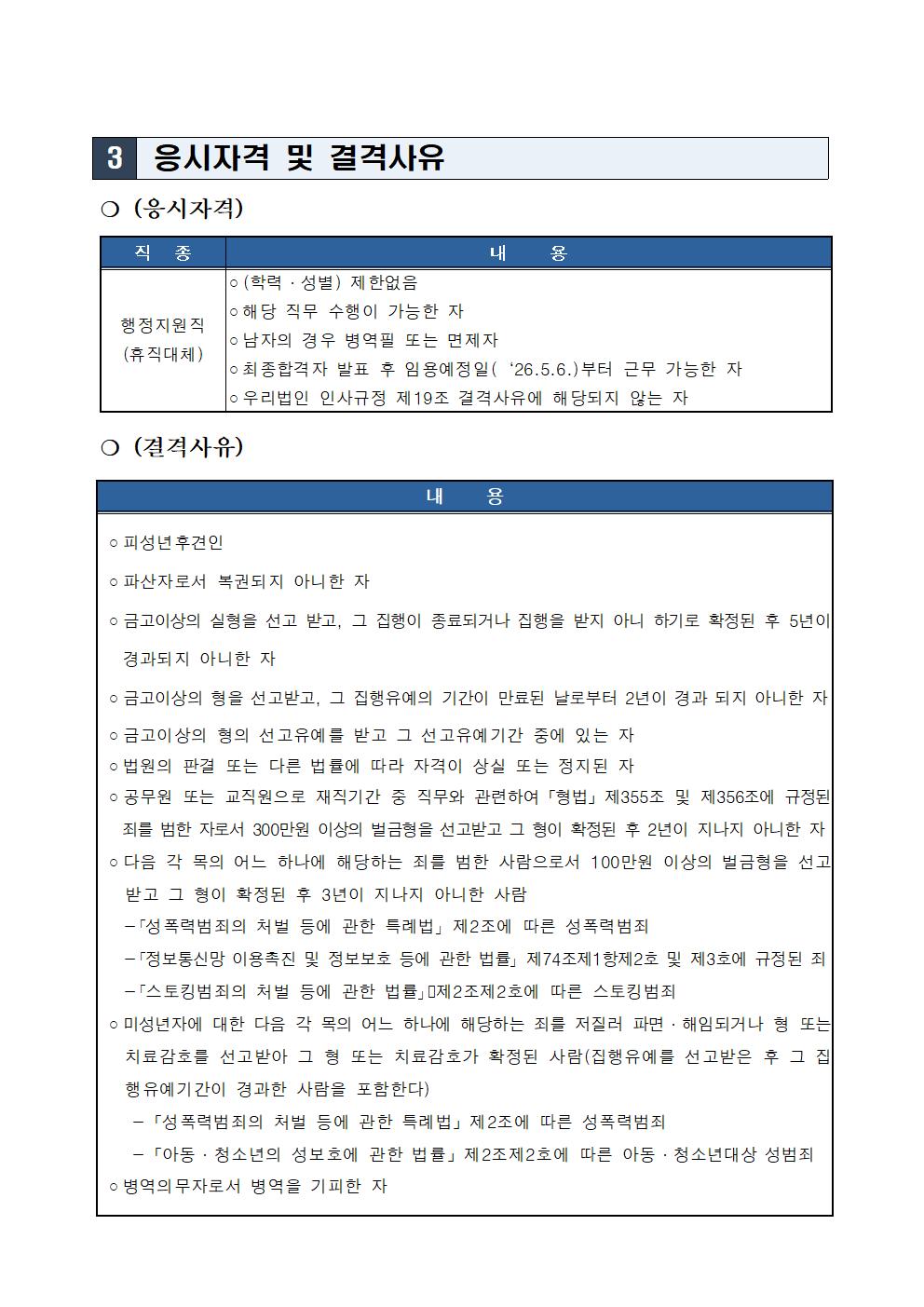 행정지원직(휴직대체인력) 채용 공고