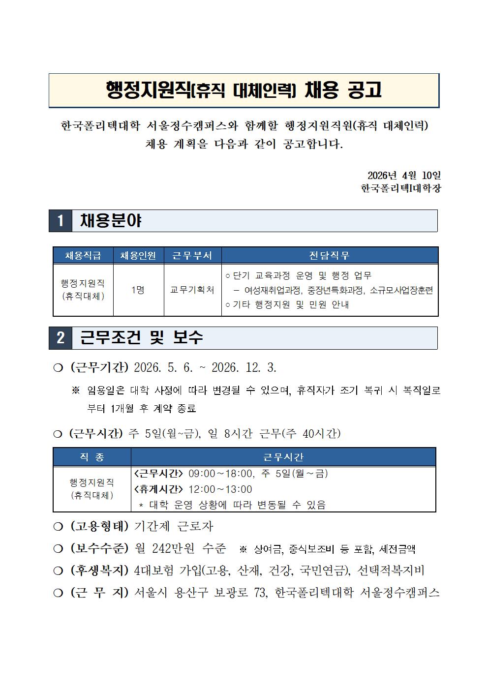 | 행정지원직(휴직대체인력) 채용 공고 | |