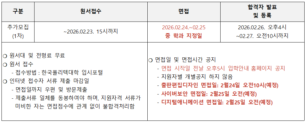 ![]() ※ 등록 취소자 발생에 따라 추가모집2차 진행 할 수 있음 2. 추가모집 학과 및 원서접수