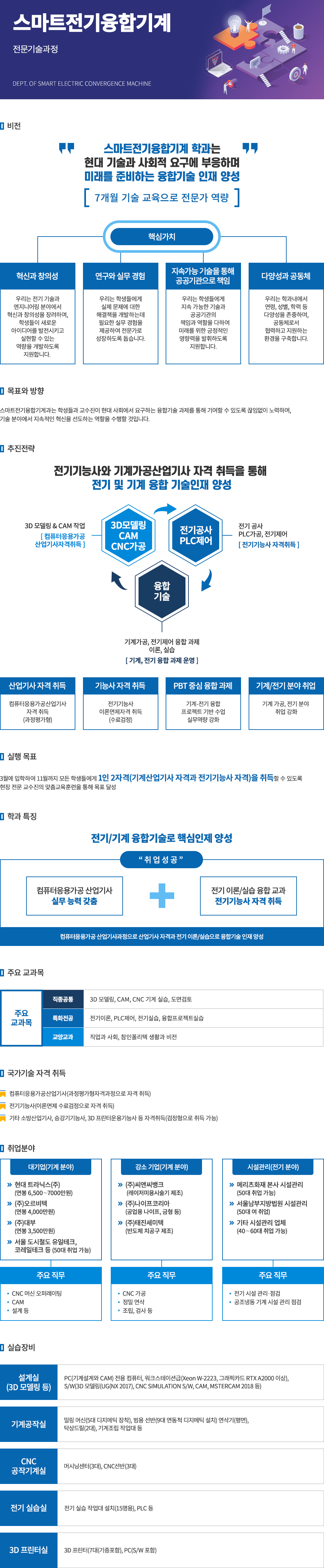 스마트전기융합기계 전문기술과정 DEPT . OF Smart electric convergence machine ■ 비전 스마트전기융합기계 학과는 현대 기술과 사회적 요구에 부응하며 미래를 준비하는 융합기술 인재 양성 [ 7개월 기술 교육으로 전문가 역량 ] ○ 핵심가치 우리는 전기 기술과 엔지니어링 분야에서 혁신과 창의성을 장려하며, 학생들이 새로운 아이디어를 발전시키고 실현할 수 있는 역량을 개발하도록 지원합니다. ○ 연구와 실무 경험 우리는 학생들에게 실제 문제에 대한 해결책을 개발하는데 필요한 실무 경험을 제공하여 전문가로 성장하도록 돕습니다. ○ 지속가능 기술을 통해 공공기관으로 책임 우리는 학생들에게 지속 가능한 기술과 공공기관의 책임과 역할을 다하여 미래를 위한 긍정적인 영향력을 발휘하도록 지원합니다. ○ 다양성과 공동체 우리는 학과내에서 연령, 성별, 학력 등 다양성을 존중하며, 공동체로서 협력하고 지원하는 환경을 구축합니다. ■ 목표와 방향 스마트전기융합기계과는 학생들과 교수진이 현대 사회에서 요구하는 융합기술 과제를 통해 기여할 수 있도록 끊임없이 노력하며, 기술 분야에서 지속적인 혁신을 선도하는 역할을 수행할 것입니다. ■ 추진전략 전기기능사와 기계가공산업기사 자격 취득을 통해 전기 및 기계 융합 기술인재 양성 ○ 3D모델링 CAM CNC가공 3D 모델링 & CAM 작업 [ 컴퓨터응용가공 산업기사자격취득 ] ○ 전기공사 PLC제어 전기 공사 PLC가공, 전기제어 [ 전기기능사 자격취득 ] ○ 융합기술 기계가공, 전기제어 융합 과제 이론, 실습 [ 기계, 전기 융합 과제 운영 ] - 산업기사 자격 취득 : 컴퓨터응용가공산업기사 자격 취득(과정평가형) - 기능사 자격 취득 : 전기기능사 이론면제자격 취득(수료검정) - PBT 중심 융합 과제 : 기계-전기 융합 프로젝트 기반 수업 실무역량 강화 - 기계/전기 분야 취업 : 기계 가공, 전기 분야 취업 강화 ■ 실행 목표 3월에 입학하여 11월까지 모든 학생들에게 1인 2자격(기계산업기사 자격과 전기기능사 자격)을 취득할 수 있도록 현장 전문 교수진의 맞춤교육훈련을 통해 목표 달성 ■ 학과 특징 전기/기계 융합기술로 핵심인제 양성 “ 취 업 성 공 ” 컴퓨터응용가공 산업기사 실무 능력 갖춤 + 전기 이론/실습 융합 교과 전기기능사 자격 취득 컴퓨터응용가공 산업기사과정으로 산업기사 자격과 전기 이론/실습으로 융합기술 인재 양성 ■ 주요 교과목 주요교과목 - 직종공통 : 3D 모델링, CAM, CNC 기계 실습, 도면검토 - 특화전공 : 전기이론, PLC제어, 전기실습, 융합프로젝트실습 - 교양교과 : 직업과 사회, 참인폴리텍 생활과 비전 ■ 국가기술 자격 취득 - 컴퓨터응용가공산업기사(과정평가형자격과정으로 자격 취득) - 전기기능사(이론면제 수료검정으로 자격 취득) - 기타 소방산업기사, 승강기기능사, 3D 프린터운용기능사 등 자격취득(검정형으로 취득 가능) ■ 취업분야 - 대기업(기계 분야) ▷현대 트라닉스(주)(연봉 6,500∼7000만원) ▷(주)오르비텍(연봉 4,000만원) ▷(주)대부 (연봉 3,500만원) ▷서울 도시철도 유일테크, 코레일테크 등(50대 취업 가능) - 주요 직무 · CNC 머신 오퍼레이팅 · CAM · 설계 등 - 강소 기업(기계 분야) ▷ (주)씨앤씨뱅크(레이저미용시술기 제조) ▷(주)나이프코리아(공업용 나이프, 금형 등) ▷(주)태진세미텍(반도체 치공구 제조) - 주요 직무 · CNC 가공 · 정밀 연삭 · 조립, 검사 등 - 시설관리(전기 분야) ▷메리츠화재 본사 시설관리(50대 취업 가능) ▷서울남부지방법원 시설관리(50대 여 취업) ▷기타 시설관리 업체(40∼60대 취업 가능) - 주요 직무 · 전기 시설 관리·점검 · 공조냉동 기계 시설 관리 점검 ■ 실습장비 ○ 설계실(3D 모델링 등) PC(기계설계와 CAM) 전용 컴퓨터, 워크스테이션급(Xeon W-2223, 그래픽카드 RTX A2000 이상), S/W(3D 모델링(UG(NX 2017), CNC SIMULATION S/W, CAM, MSTERCAM 2018 등) ○ 기계공작실 밀링 머신(5대 디지메틱 장착), 범용 선반(9대 연동척 디지메틱 설치) 연삭기(평면), 탁상드릴(2대), 기계조립 작업대 등 ○ CNC 공작기계실 머시닝센터(3대), CNC선반(3대) ○ 전기 실습실 전기 실습 작업대 설치(15명용), PLC 등 ○ 3D 프린터실 3D 프린터(7대(기증포함), PC(S/W 포함)