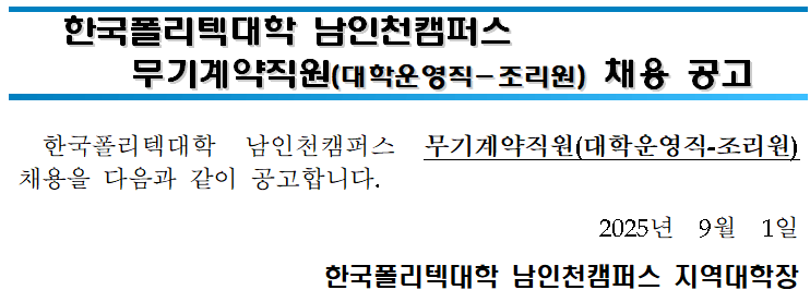 | 한국폴리텍대학 남인천캠퍼스 무기계약직원(대학운영직_조리원) 채용 공고 | |