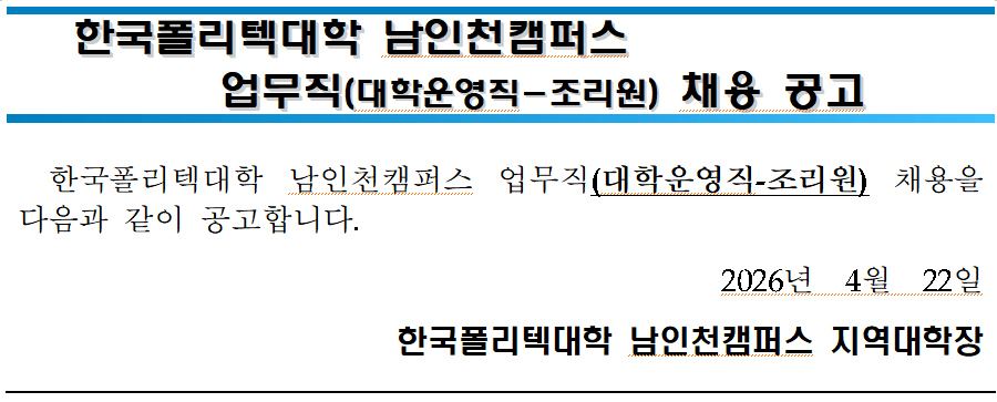 | 한국폴리텍대학 남인천캠퍼스 업무직(대학운영직_조리원) 채용 공고 | |