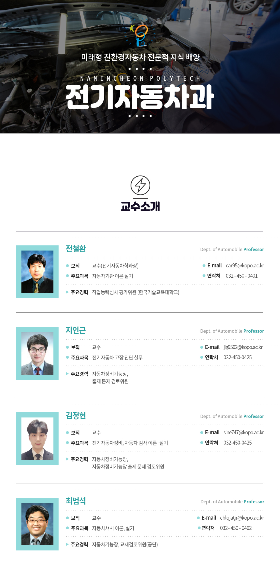 미래형 친환경자동차 전문적 지식 배양 N A M I N C H E O N P O L Y T E C H 전기자동차과 교수소개 ◎ 전철환 Dept. of Automobile Professor - 보직 : 교수(전기자동차학과장) - E-mail : car95@kopo.ac.kr - 주요과목 : 자동차기관 이론 실기 - 연락처 : 032 - 450 - 0401 - 주요경력 : 직업능력심사 평가위원 (한국기술교육대학교) ◎ 지인근 Dept. of Automobile Professor - 보직 : 교수 - E-mail : jig9502@kopo.ac.kr - 주요과목 : 전기자동차 고장 진단 실무 - 연락처 : 032-450-0425 - 주요경력 : 자동차정비기능장, 출제 문제 검토위원 ◎ 김정현 Dept. of Automobile Professor - 보직 : 교수 - E-mail : sine747@kopo.ac.kr - 주요과목 : 전기자동차정비, 자동차 검사 이론·실기 - 연락처 : 032-450-0425 - 주요경력 : 자동차정비기능장, 자동차정비기능장 출제 문제 검토위원 ◎ 최범석 Dept. of Automobile Professor - 보직 : 교수 - E-mail : chlqjatjr@kopo.ac.kr - 주요과목 : 자동차섀시 이론, 실기 - 연락처 : 032-450-0402 - 주요경력 : 자동차기능장, 교재검토위원(공단)
