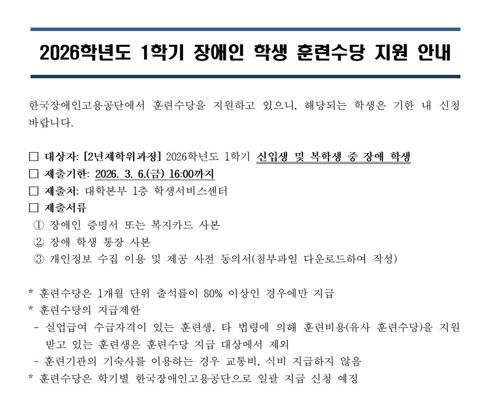 | 2026학년도 1학기 장애인 학생 훈련수당 지원 안내 | |