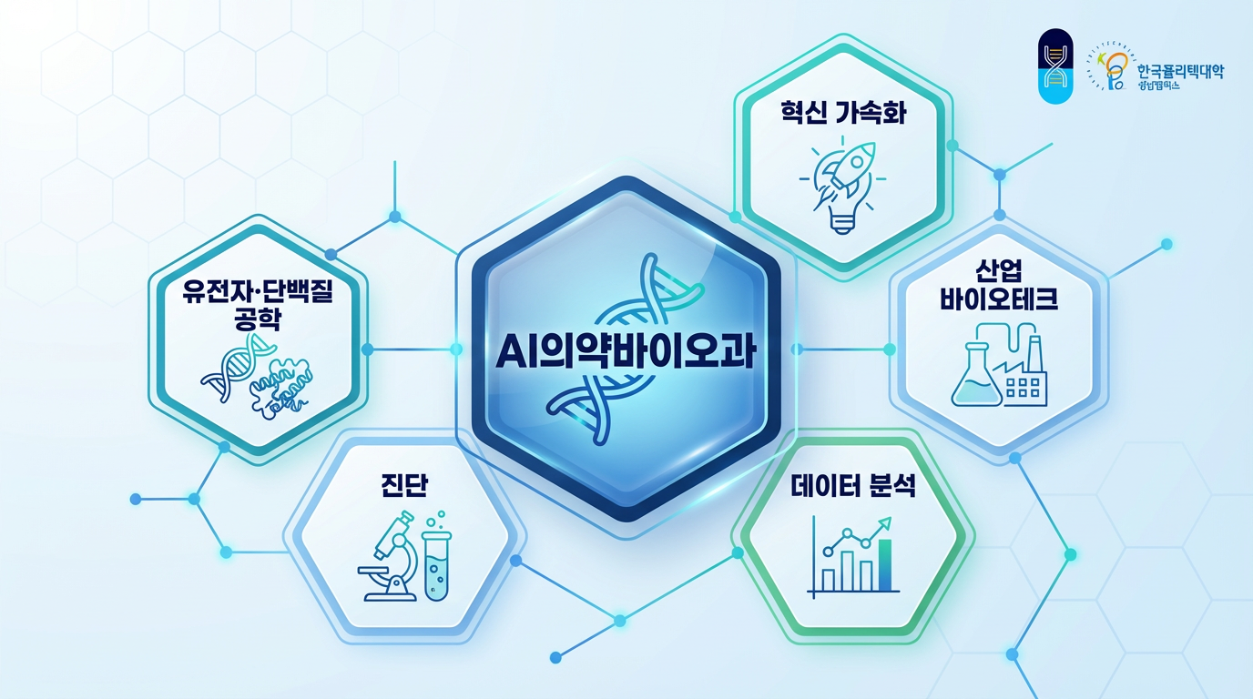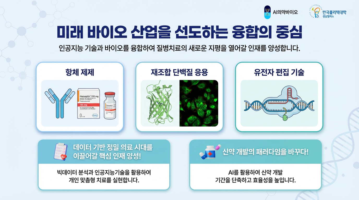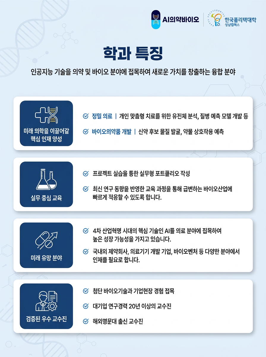 I의약바이오 학과소개 미래 의학을 선도하는 융합의 중심! 인공지능기술과 바이오를 융합하여 질병 치료의 새로운 지평을 열어갈 인재를 양성합니다. ● 데이터 기반 정밀 의료 시대를 이끌어갈 핵심 인재 양성! 빅데이터 분석과 인공지능기술을 활용하여 개인 맞춤형 치료를 실현합니다. ● 신약 개발의 패러다임을 바꾸다! AI를 활용하여 신약 개발 기간을 단축하고 효율성을 높입니다. ● 학과목표 - 정밀의료 관련 인력양성 기반 확보를 목적으로 유전체 정보 등의 바이오 빅데이터 활용을 통해 질병의 진단 및 생물학적 제제 제조및 생산기술을 포함하는 융복합 인재의 양성 - 개개인 맞춤형 정밀 진단/바이오의약품의 개발, 제조, 품질관리에 대한 기초기술부터 현장실무 기술을 갖춘 인력 양성 ● 학과특징 인공지능 기술을 의약 및 바이오 분야에 접목하여 새로운 가치를 창출하는 융합 분야. ○ 미래 의학을 이끌어갈 핵심 인재 양성 - 정밀 의료 : 개인 맞춤형 치료를 위한 유전체 분석, 질병 예측 모델 개발, 등. - 바이오의약품 개발 : 신약 후보 물질 발굴, 약물 상호작용 예측. ○ 실무 중심 교육 - 프로젝트 실습을 통합 실무형 포트폴리오 작성. - 최신 연구 동향을 반영한 교육 과정을 통해 급변하는 바이오산업에 빠르게 적응할 수 있도록 합니다. ○ 미래 유망 분야 - 4차 산업혁명 시대의 핵심 기술인 AI를 의료 분야에 접목하여 높은 성장 가능성을 가지고 있습니다. - 국내외 제약회사, 의료기기 개발 기업, 바이오벤처 등 다양한 분야에서 인재를 필요로 합니다. ○ 검증된 우수 강사진 - 첨단 바이오기술과 기업현장 경험 접목 - 대기업 연구경력 20년 이상의 교수진 - 해외명문대 출신 교수진