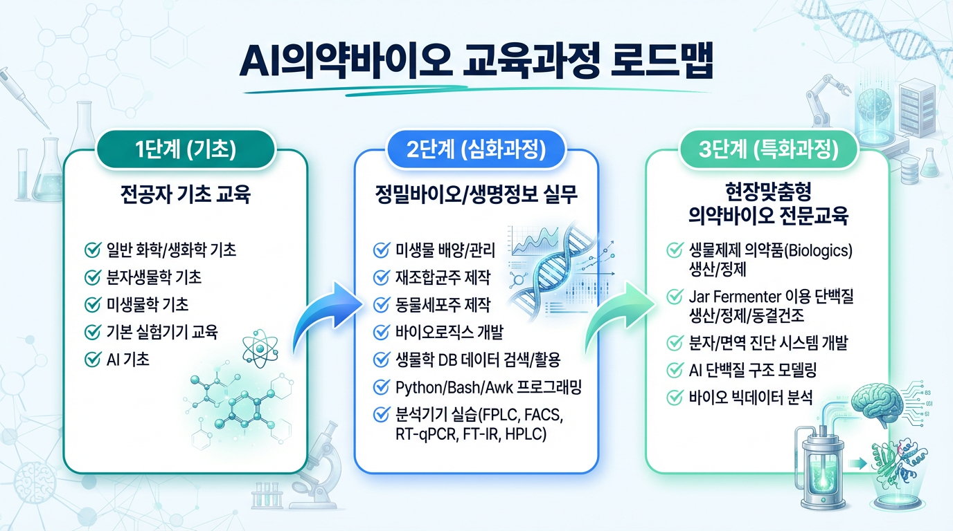 "AI의약바이오 교육과정 Roadmap" AI의약바이오 교육과정 Roadmap ● 1단계 (기초) 8주 전공자 기초 교육 - 일반 화학 / 생화학 기초 - 분자생물학 기초 - 미생물학 기초 - 기본 실험기기 교육 - AI 기초 ● 2단계(심화과정) 14주 정밀바이오/생명정보 실무 - 미생물 배양/관리 - 재조합균주 제작 - 동물세포주 제작 - 바이오로직스 - 생물학 DB 데이터 검색/활용 - Python/Bash/Awk 교육/프로그램잉 - 분석기기 실습(FPLC, FACS, RT-qPCR, FT-IR, HPLC 등) ● 3단계(특화과정) 10주 현장맞춤형 의약바이오 전문교육> - 생물제제 의약품(Biologics) 생산/정제 - Jar Fermenter 이용 단백질 생산/정제/동결건조 - 분자/면역 진단 시스템개발 - AI 단백질 구조 모델링 - 바이오 빅데이터 분석