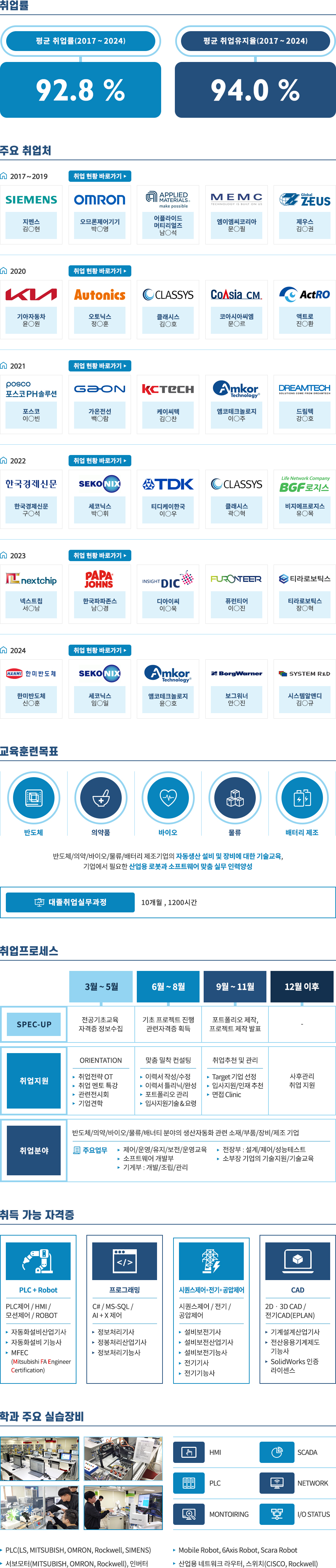 ■ 취업률 ▷ 평균 취업률(2017 ~ 2024) 92.8 % ▷ 평균 취업유지율(2017 ~ 2024) 94.0 % ■ 주요 취업처 ▷ 2017 ~ 2019 취업현황 바로가기 - SIEMENS 지멘스 김○현 - OMRON 오므론제어기기 박○영 - APPLIED MATERIALS make possible 어플라이드 머티리얼즈 남○석 - MEMC TECHNOLOGY IS BUILT ON US 엠이엠씨코리아 문○필 - Gobal ZEUS 제우스 김○권 ▷ 2020 취업현황 바로가기 - KIA 기아자동차 윤○원 - Autonics 오토닉스 정○훈 - CLASSYS 클래시스 김○호 - CoAsia CM 코아시아씨엠 문○르 - ActRO 액트로 진○환 ▷2021 취업현황 바로가기 - 포스코PH솔루션 포스코 이○빈 - GaON 가온전선 백○람 - KCTeCH 케이씨텍 김○찬 - Amkor Technology 앰코테크놀로지 이○주 - DREAMTECH SOLUTIONS COME FROM DREAMTECH 드림텍 강○호 ▷2022 취업현황 바로가기 - 한국경제신문 한국경제신문 구○석 - SEKONIX 세코닉스 박○휘 - TDK 티디케이한국 이○우 - CLASSYS 클래시스 곽○혁 - BGF로지스 비지에프로지스 유○목 ▷2023 취업현황 바로가기 - nextchip 넥스트칩 서○남 - PAPA JOHNS 한국파파존스 남○경 - INSIGHT DIC 디아이씨 이○욱 - FURONTEER 퓨런티어 이○진 - 티라로보틱스 티라로보틱스 장○혁 ▷2024 취업현황 바로가기 - 한미반도체 한미반도체 신○훈 - SEKONIX 세코닉스 임○일 - Amkor Technology 앰코테크놀로지 윤○호 - BorgWarner 보그워너 안○진 - SYSTEM R&D 시스템알앤디 김○규 ■ 취득 가능 자격증 ▷ PLC + Robot : PLC제어 / HMI / 모션제어 / ROBOT - 자동화설비산업기사 - 자동화설비 기능사 - MFEC(Mitsubishi FA Engineer Certification) ▷ 프로그래밍 : C# / MS-SQL / AI+ X 제어 - 정보처리기사 - 정봉처리산업기사 - 정보처리기능사 ▷ 시퀀스제어 + 전기 + 공압제어 : 시퀀스제어 / 전기 / 공압제어 - 설비보전기사 - 기계정비산업기사 - 설비보전기능사 - 전기기사 - 전기기능사 ▷ CAD : 2D·3D CAD / 전기CAD(EPLAN) - 기계설계산업기사 - 전산응용기계제도기능사 - SolidWorks 인증 라이센스 ■ 교육훈련목표 반도체 | 의약 | 바이오 | 물류 | 배터리 제조 반도체/의약/바이오/물류/배터리 제조기업의 자동생산 설비 및 장비에 대한 기술교육, 기업에서 필요한 산업용 로봇과 소프트웨어 맞춤 실무 인력양성 ▷ 대졸취업실무과정 10개월, 1200시간 ■ 취업프로세스 ▷ SPEC-UP - 3월 ~ 5월 : 전공기초교육 자격증 정보수집 - 6월 ~ 8월 : 기초 프로젝트 진행 관련자격증 획득 - 9월 ~ 11월 : 포트폴리오 제작, 프로젝트 제작 발표 - 12월 이후 : 사후관리 취업 지원 ▷ 취업지원 - 3월 ~ 5월 : ORIENTATION · 취업전략 OT · 취업 멘토 특강 · 관련전시회, 기업견학 - 6월 ~ 8월 : 맞춤 밀착 컨설팅 · 이력서 작성/수정 · 이력서 틀리닉/완성 · 포트폴리오 관리 · 입사지원 기술 & 요령 - 9월 ~ 11월 : 취업추천 및 관리 · Target 기업 선정 · 입사지원/인재 추천 · 면접 Clinic 취업성공 - 12월 이후 : 사후관리 취업지원 ▷ 취업분야 - 반도체/의약/바이오/물류/배너티 분야의 생산자동화 관련 소재/부품/장비/제조 기업 - 주요업무 · 제어/운영/유지/보전/운영교육 · 소프트웨어 개발부 · 기게부 : 개발/조립/관리 · 전장부 : 설계/제어/성능테스트 · 소부장 기업의 기술지원/기술교육 ■ 취득 가능 자격증 - PLC + Robot PLC제어 / HMI / 모션제어 / ROBOT 자동화설비산업기사 자동화설비 기능사 MFEC (Mitsubishi FA Engineer Certification) - 프로그래밍 C# / MS-SQL / AI + X 제어 정보처리기사 정봉처리산업기사 정보처리기능사 - 시퀀스제어 + 전기 + 공압제어 시퀀스제어 / 전기 / 공압제어 설비보전기사 설비보전산업기사 설비보전기능사 전기기사 전기기능사 - CAD 2D · 3D CAD / 전기CAD(EPLAN) 기계설계산업기사 전산응용기계제도 기능사 SolidWorks 인증 라이센스 ■ 학과 주요 실습장비 - HMI - SCADA - PLC - NETWORK - MONTOIRING - I/O STATUS ▷ PLC(LS, MITSUBISH, OMRON, Rockwell, SIMENS) ▷ 서보모터(MITSUBISH, OMRON, Rockwell), 인버터 ▷ Mobile Robot, 6Axis Robot, Scara Robot ▷ 산업용 네트워크 라우터, 스위치(CISCO, Rockwell)