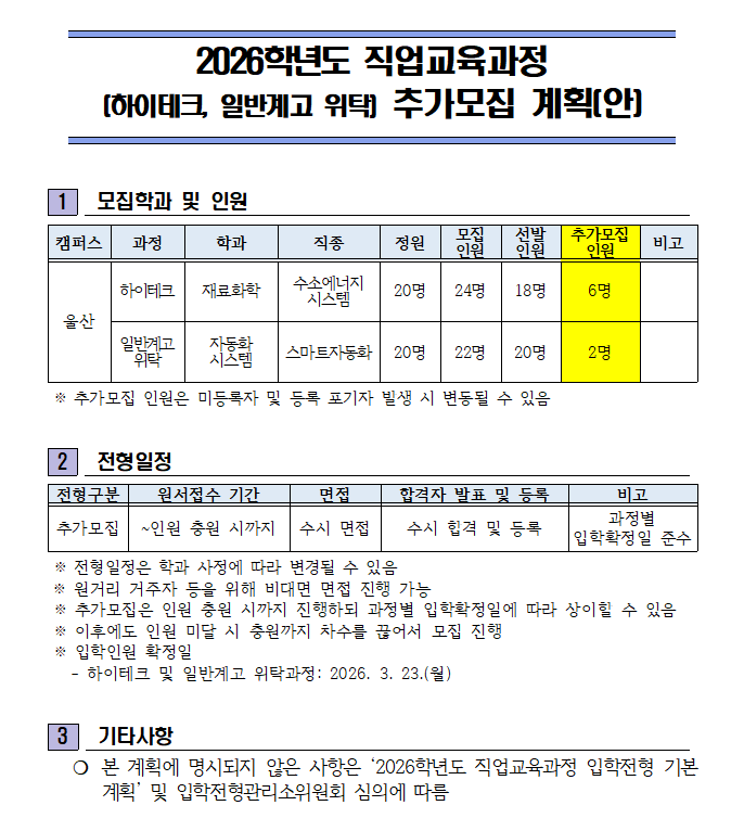 | 2026학년도 직업교육과정(하이테크, 고교위탁) 추가모집 안내 | |