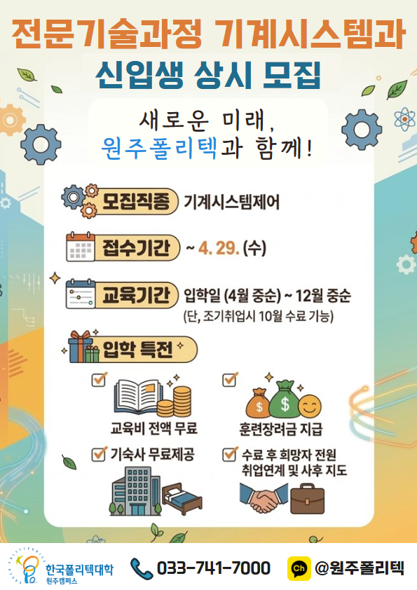 2026학년도 원주캠퍼스 상시입학제 신입생 모집요강을 붙임과 같이 안내 드리오니 많은 관심과 지원 부탁 드립니다. ![]() |