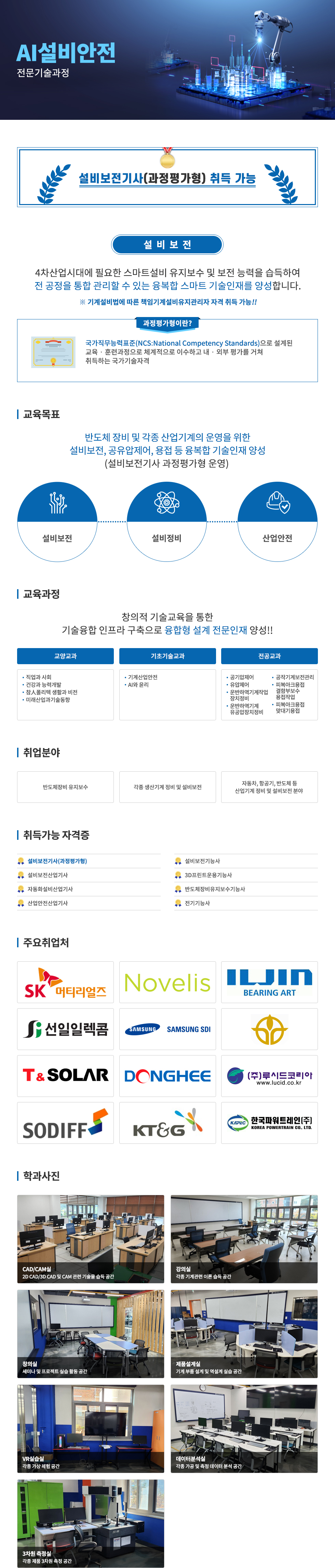 AI설비안전 전문기술과정 설비보전기사(과정평가형) 취득 가능 설비보전 4차산업시대에 필요한 스마트설비 유지보수 및 보전 능력을 습득하여 전 공정을 통합 관리할 수 있는 융복합 스마트 기술인재를 양성합니다. ※ 기계설비법에 따른 책임기계설비유지관리자 자격 취득 가능!! 과정평가형이란? 국가직무능력표준(NCS:National Competency Standards)으로 설계된 교육 · 훈련과정으로 체계적으로 이수하고 내 · 외부 평가를 거쳐 취득하는 국가기술자격 □ 교육목표 반도체 장비 및 각종 산업기계의 운영을 위한 설비보전, 공유압제어, 용접 등 융복합 기술인재 양성 (설비보전기사 과정평가형 운영) - 설비보전 - 설비정비 - 산업안전 □ 교육과정 창의적 기술교육을 통한 기술융합 인프라 구축으로 융합형 설계 전문인재 양성!! - 교양교과 · 직업과 사회 · 건강과 능력개발 · 참人폴리텍 생활과 비전 · 미래산업과기술동향 - 기초기술교과 · 기계산업안전 · AI와 윤리 - 전공교과 · 공기압제어 · 유압제어 · 운반하역기계작업장치정비 · 운반하역기계유공압장치정비 · 공작기계보전관리 · 피복아크용접결함부보수용접작업 · 피복아크용접맞대기용접 □ 취업분야 - 반도체장비 유지보수 - 각종 생산기계 정비 및 설비보전 - 자동차, 항공기, 반도체 등 산업기계 정비 및 설비보전 분야 □ 취득가능 자격증 - 설비보전기사(과정평가형) - 설비보전산업기사 - 자동화설비산업기사 - 산업안전산업기사 - 설비보전기능사 - 3D프린트운용기능사 - 반도체장비유지보수기능사 - 전기기능사 □ 주요취업처 SK머티리얼즈, Novelis, ILJIN BEARING ART, 선일일렉콤, 삼성 SDI, T & SOLAR, DONGHEE, (주)루시드코리아, SODIFF, KT&G, 한국파워트레인(주) □ 학과사진 - CAD/CAM실 2D CAD/3D CAD 및 CAM 관련 기술을 습득 공간 - 강의실 각종 기계관련 이론 습득 공간 - 창의실 세미나 및 프로젝트 실습 활동 공간 - 제품설계실 기계 부품 설계 및 역설계 실습 공간 - VR실습실 각종 가상 체험 공간 - 데이터분석실 각종 가공 및 측정 데이터 분석 공간 - 3차원 측정실 각종 제품 3차원 측정 공간