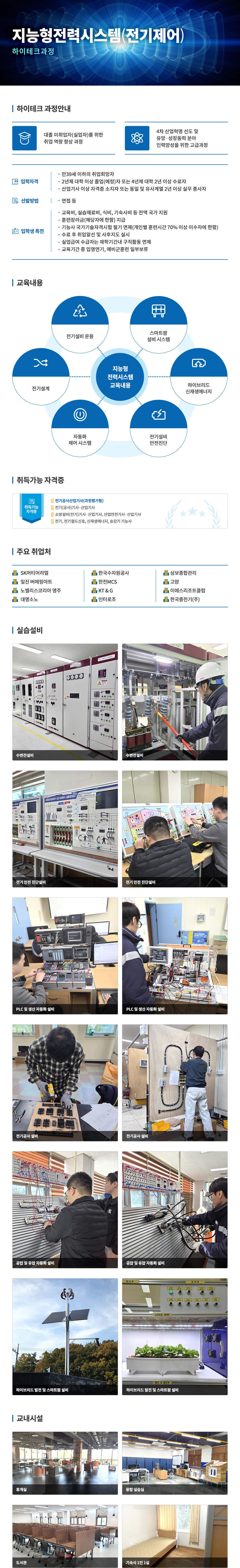 지능형전력시스템(전기제어) 하이테크과정 ■ 하이테크 과정안내 ▷ 대졸 미취업자(실업자)를 위한 취업 역량 향상 과정 ▷ 4차 산업혁명 선도 및 유망·성장동력 분야 인력양성을 위한 고급과정 - 입학자격 · 만39세 이하의 취업희망자 · 2년제 대학 이상 졸업(예정)자 또는 4년제 대학 2년 이상 수료자 · 산업기사 이상 자격증 소지자 또는 동일 및 유사계열 2년 이상 실무 종사자 - 선발방법 · 면접 등 - 입학생 특전 · 교육비, 실습재료비, 식비, 기숙사비 등 전액 국가 지원 · 훈련장려금(해당자에 한함) 지급 · 기능사 국가기술자격시험 필기 면제(개인별 훈련시간 70% 이상 이수자에 한함) · 수료 후 취업알선 및 사후지도 실시 · 실업급여 수급자는 재학기간내 구직활동 면제 · 교육기간 중 입영연기, 예비군훈련 일부보류 ■ 교육내용 - 전기설비 운용 - 스마트팜 설비 시스템 - 전기설계 - 하이브리드 신재생에너지 - 자동화 제어 시스템 - 전기설비 안전진단 ■ 취득가능 자격증 취득가능 자격증 - 전기공사산업기사(과정평가형) - 전기(공사)기사·산업기사 - 소방설비(전기)기사·산업기사, 산업안전기사·산업기사 - 전기, 전기철도신호, 신재생에너지, 승강기 기능사 ■ 주요 취업처 - SK머티어리얼 - 한국수자원공사 - 삼보종합관리 - 일진 베어링아트 - 한전MCS - 고암 - 노벨리스코리아 영주 - KT & G - 이에스리조트클럽 - 대명소노 - 인터로조 - 한국중전기(주) ■ 실습설비 - 수변전설비 - 전기 안전 진단설비 - PLC 및 생산 자동화 설비 - 전기공사 설비 - 공압 및 유압 자동화 설비 - 하이브리드 발전 및 스마트팜 설비 ■ 교내시설 - 휴게실 - 융합 실습실 - 도서관 - 기숙사 1인 1실