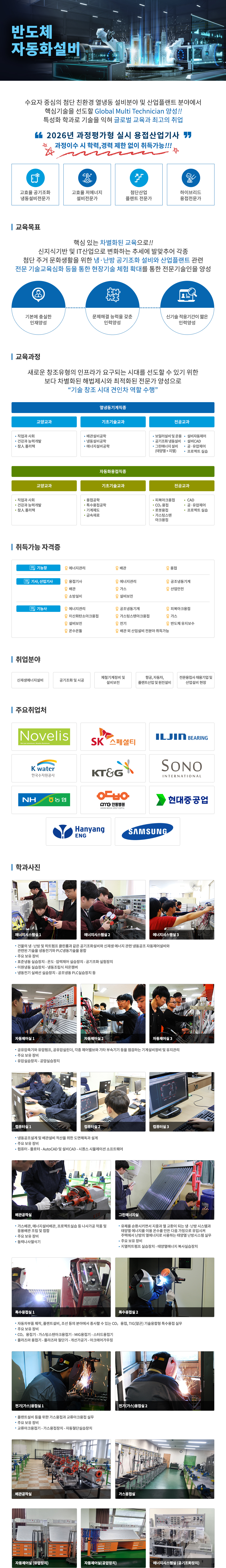반도체 자동화설비 수요자 중심의 첨단 친환경 열냉동 설비분야 및 산업플랜트 분야에서 핵심기술을 선도할 Global Multi Technician 양성!! 특성화 학과로 기술을 익혀 글로벌 교육과 최고의 취업 "2026년 과정평가형 실시 용접산업기사" 과정이수 시 학력,경력 제한 없이 취득가능!!! - 고효율 공기조화 냉동설비전문가 - 고효율 저에너지 설비전문가 - 첨단산업 플랜트 전문가 - 하이브리드 용접전문가 ■ 교육목표 핵심 있는 차별화된 교육으로!! 신지식기반 및 IT산업으로 변화하는 추세에 발맞추어 각종 첨단 주거 문화생활을 위한 냉·난방 공기조화 설비와 산업플랜트 관련 전문 기술교육심화 등을 통한 현장기술 체험 확대를 통한 전문기술인을 양성 - 기본에 충실한 인재양성 - 문제해결 능력을 갖춘 인력양성 - 신기술 적응기간이 짧은 인력양성 ■ 교육과정 새로운 창조유형의 인프라가 요구되는 시대를 선도할 수 있기 위한 보다 차별화된 해법제시와 최적화된 전문가 양성으로 “기술 창조 시대 견인차 역할 수행” □ 열냉동기계직종 - 교양교과 · 직업과 사회 · 건강과 능력개발 · 참人 폴리텍 - 기초기술교과 · 배관설비공학 · 냉동설비공학 · 에너지설비공학 - 전공교과 · 보일러설비 및 운용 · 공기조화 냉동설비 · 그린에너지 설비(태양열 + 지열) · 설비자동제어 · 설비CAD · 공·유압제어 · 프로젝트 실습 □ 자동화용접직종 - 교양교과 · 직업과 사회 · 건강과 능력개발 · 참人 폴리텍 - 기초기술교과 · 용접공학 · 특수용접공학 · 기계제도 · 금속재료 - 전공교과 · 피복아크용접 · CO₂용접 · 로봇용접 · 가스텅스텐 아크용접 · CAD · 공·유압제어 · 프로젝트 실습 ■ 취득가능 자격증 - 기능장 · 에너지관리 · 배관 · 용접 - 기사, 산업기사 · 용접기사 · 에너지관리 · 공조냉동기계 · 배관 · 가스 · 산업안전 · 소방설비 · 설비보전 - 기능사 · 에너지관리 · 공조냉동기계 · 피복아크용접 · 이산화탄소아크용접 · 가스텅스텐아크용접 · 가스 · 설비보전 · 전기 · 반도체 유지보수 · 온수온돌 · 배관 외 산업설비 전분야 취득가능 ■ 취업분야 - 신재생에너지설비 - 공기조화 및 시공 - 제철기계정비 및 설비보전 - 항공, 자동차, 플랜트산업 및 원전설비 - 전문용접사 채용기업 및 산업설비 현장 ■ 주요취업처 ■ 학과사진 - 에너지시스템실 1, 에너지시스템실 2, 에너지시스템실 3 · 건물의 냉·난방 및 히트펌프 클린룸과 같은 공기조화설비와 신재생 에너지 관련 냉동공조 자동제어설비와 관련된 기술을 냉동전기와 PLC냉동기술을 융합 · 주요 보유 장비 · 표준냉동 실습장치 - 온도·압력제어 실습장치 - 공기조화 실험장치 · 이원냉동 실습장치 - 냉동조립식 저온챔버 · 냉동전기 실배선 실습장치 - 공조냉동 PLC실습장치 등 - 자동제어실 1, 자동제어실 2, 자동제어실 3 · 공유압축기와 유압펌프, 공유압실린더, 각종 제어밸브와 기타 부속기기 등을 점검하는 기계설비정비 및 유지관리 · 주요 보유 장비 · 유압실습장치 - 공압실습장치 - 컴퓨터실 1, 컴퓨터실 2, 컴퓨터실 3 · 냉동공조설계 및 배관설비 적산을 위한 도면해독과 설계 · 주요 보유 장비 · 컴퓨터 - 플로터 - AutoCAD 및 설비CAD - 시퀀스 시뮬레이션 소프트웨어 - 배관공작실 · 가스배관, 에너지설비배관, 프로젝트실습 등 나사가공 작품 및 응용배관 조립 및 접합 · 주요 보유 장비 · 동력나사절삭기 - 그린에너지실 · 유체를 순환시키면서 지중과 열 교환이 되는 냉·난방 시스템과 태양열 에너지를 이용 온수를 만든 다음 가정으로 유입시켜 주택에서 난방의 열에너지로 사용하는 태양열 난방시스템 실무 · 주요 보유 장비 · 지열히트펌프 실습장치 - 태양열에너지 복사실습장치 - 특수용접실 1, 특수용접실 2 · 자동차부품 제작, 플랜트설비, 조선 등의 분야에서 종사할 수 있는 CO₂용접, TIG(알곤) 기술융합형 특수용접 실무 · 주요 보유 장비 · CO₂용접기 - 가스텅스텐아크용접기 - MIG용접기 - 스터드용접기 · 플라즈마 용접기 - 플라즈마 절단기 - 개선가공기 - 아크에어가우징 - 전기(가스)용접실 1, 전기(가스)용접실 2 · 플랜트설비 등을 위한 가스용접과 교류아크용접 실무 · 주요 보유 장비 · 교류아크용접기 - 가스용접장치 - 자동절단실습장치 - 배관공작실 - 가스용접실 - 자동제어실 (유압장치) - 자동제어실(공압장치) - 에너지시스템실 (공기조화장치)